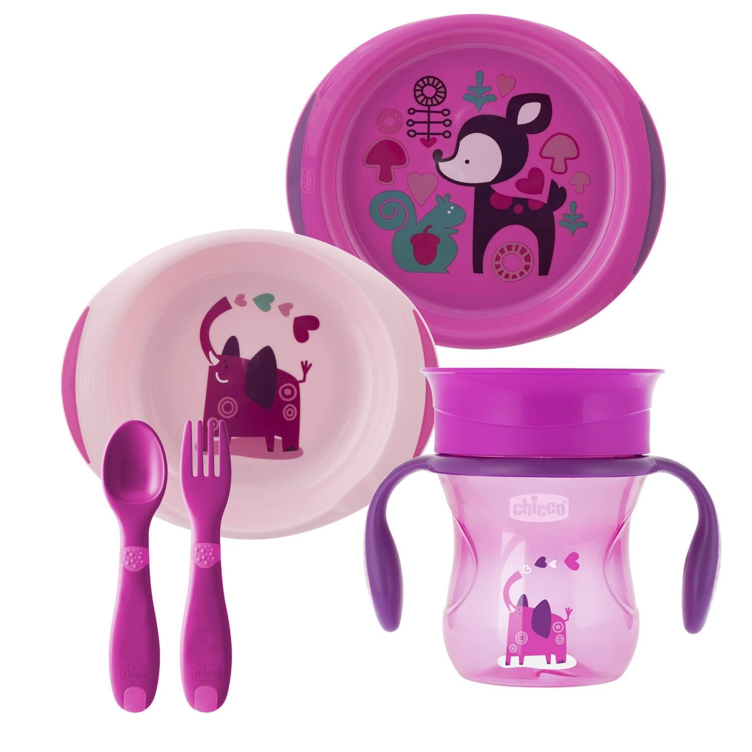 Набор посуды Chicco создан для девочек старше 1 года. В него входят: поильник, 2 тарелки, вилка, ложка. Посуда Meal Set изготовлена из безопасного розового пластика, не содержит BPA (бисфенол А). Украшена милыми рисунками, которые стимулируют аппетит и воображение. Поильник Perfect Cup развивает навыки питья из чашки, без проливания. Набор столовых приборов First Cutlery (вилка и ложка) приучает ребенка есть самостоятельно. Набор из двух тарелок Dish Set (мелкая и глубокая) обеспечивает максимальный комфорт приема пищи.