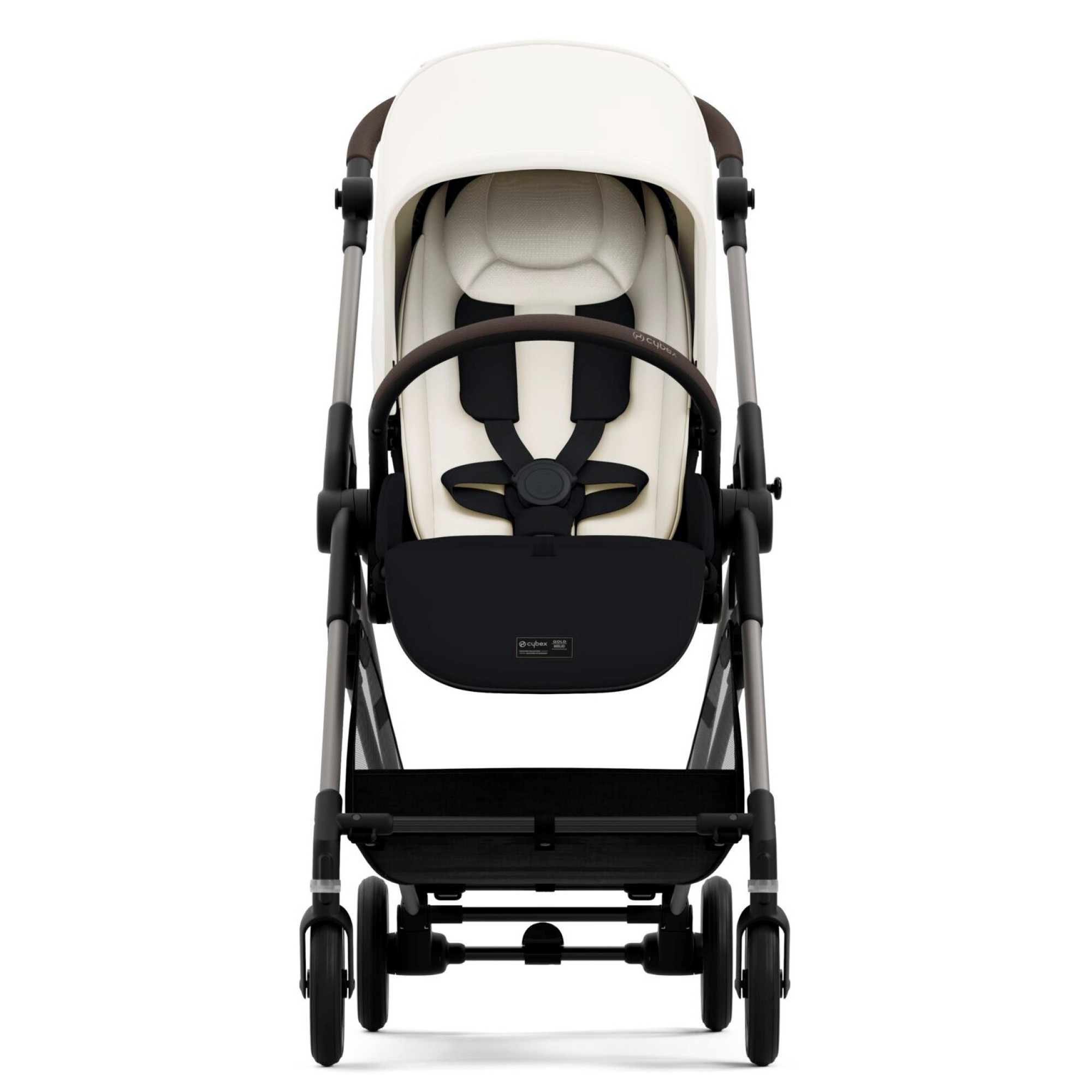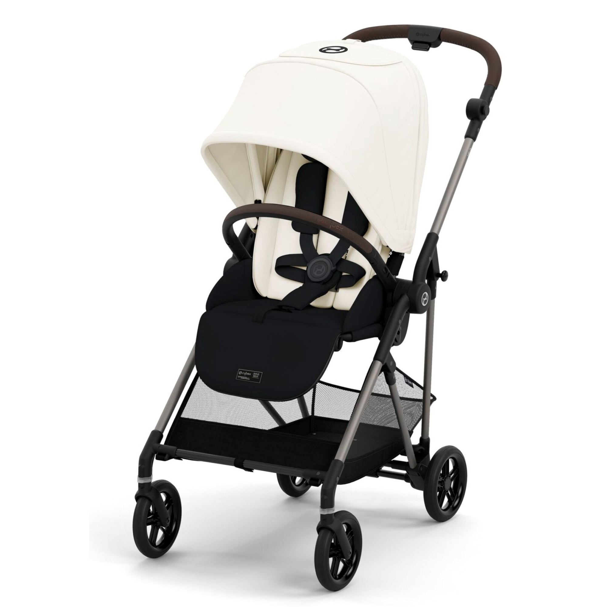 Прогулочная коляска Cybex Melio Carbon Moon Black комплектуется: шасси с колесами, прогулочный блок с бампером, нижняя корзина для покупок.