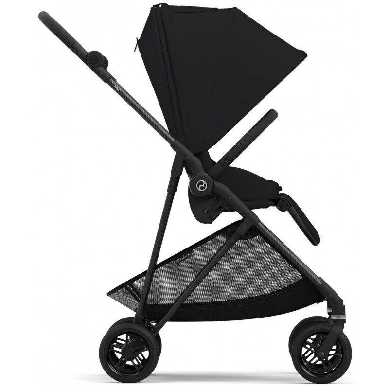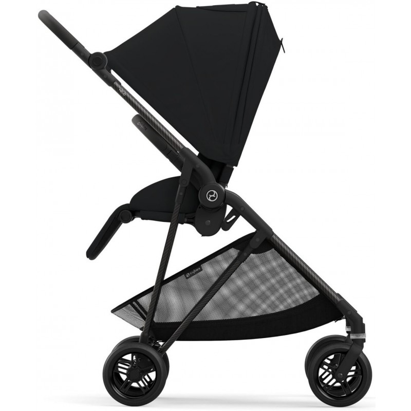 Прогулочная коляска Cybex Melio Carbon Moon Black комплектуется: шасси с колесами, прогулочный блок с бампером, нижняя корзина для покупок.