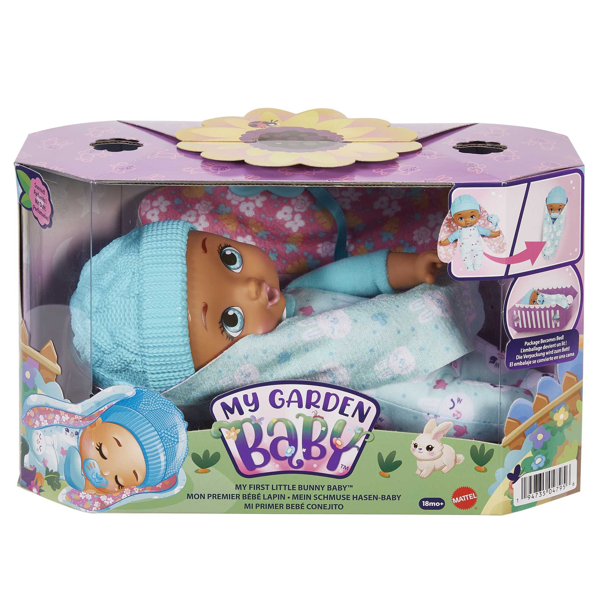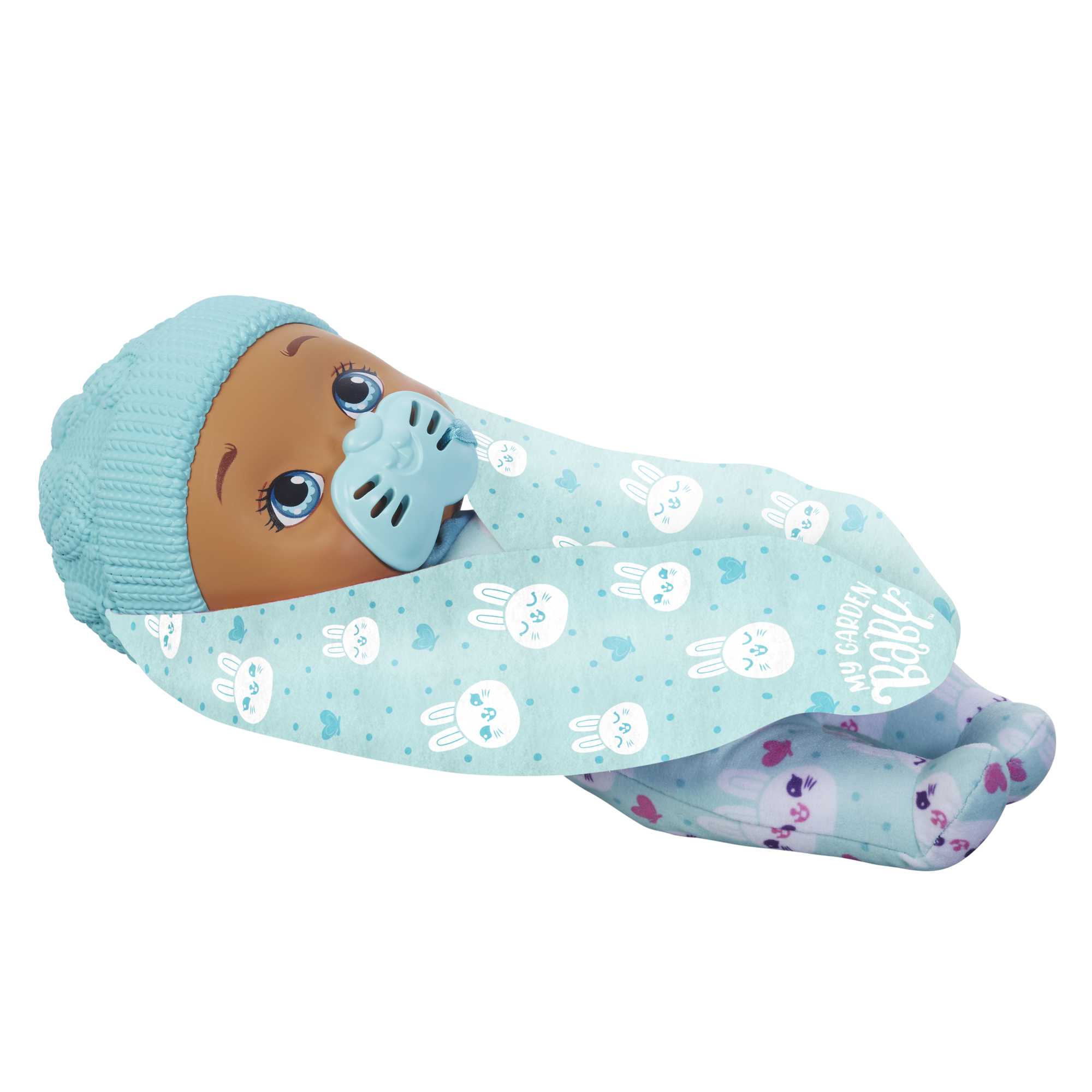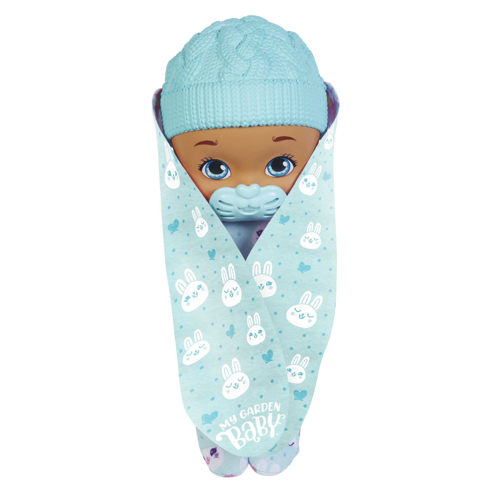 Подарите малышам радость вместе с пупсиком My garden baby Голубой зайчонок! Детям понравятся длинные ушки зайчика, вязаная шляпка и цветочный аромат. Игрушка имеет мягкое тело 23 см высотой — идеальный размер для детских ручонок. Тканевые ушки превращаются в пеленку, которой можно запеленать пупса.