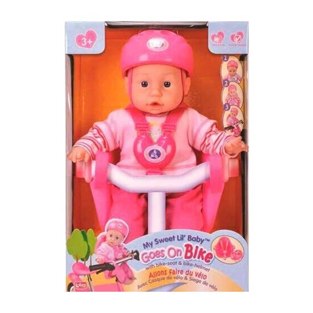 Милый пупс с мягким телом, одетый в розовые штанишки и полосатую кофточку. На голове у пупса розовый шлем, также в наборе кресло для пупса, которое удобно крепить к рулю детского велосипеда, чтобы Ваша дочурка могла брать пупса с собой на велопрогулку!