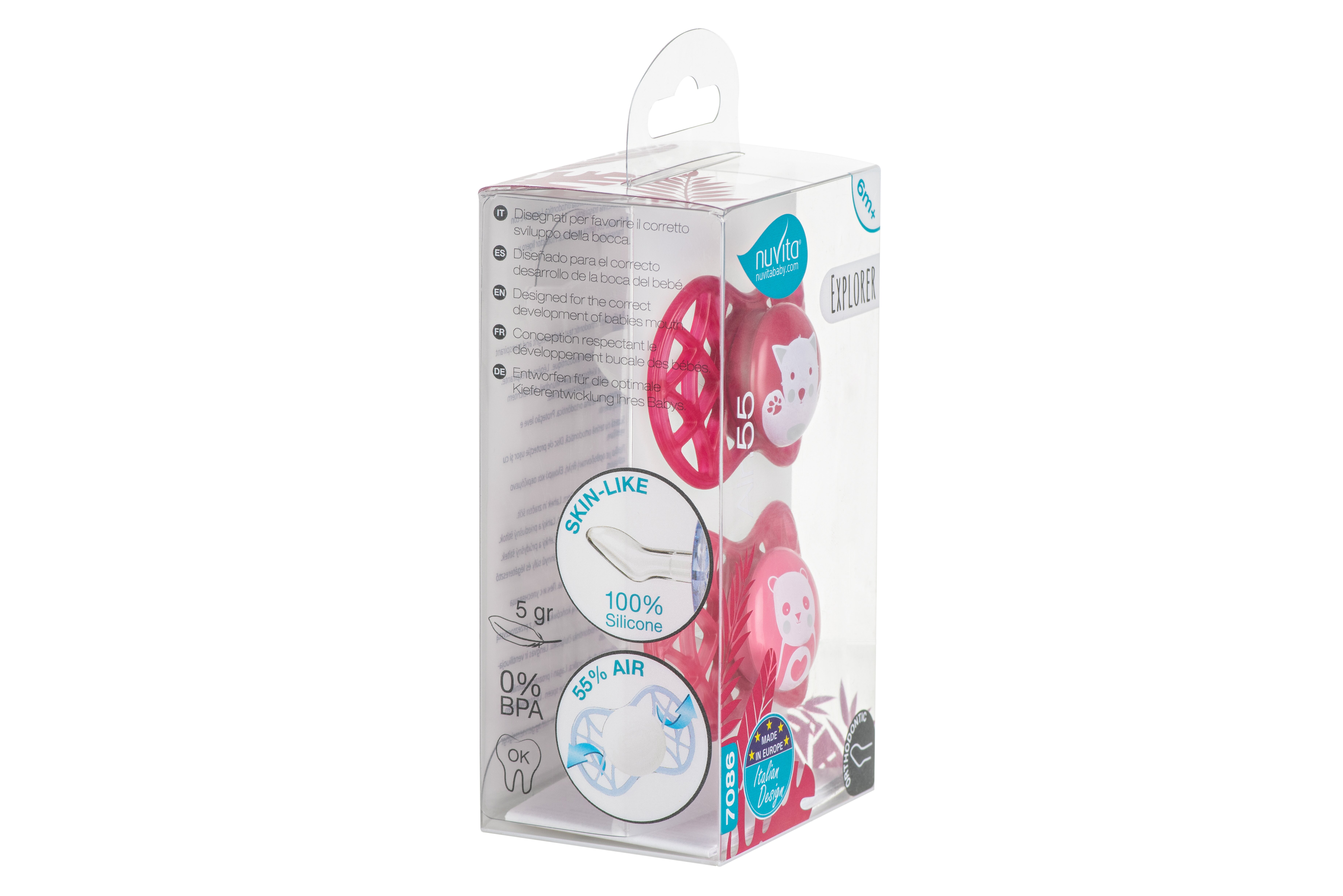 Пластина соски на 55% состоит из воздуха, обеспечивая почти полную аэрацию области вокруг рта, избегая скопления слюны, которая может раздражать кожу.