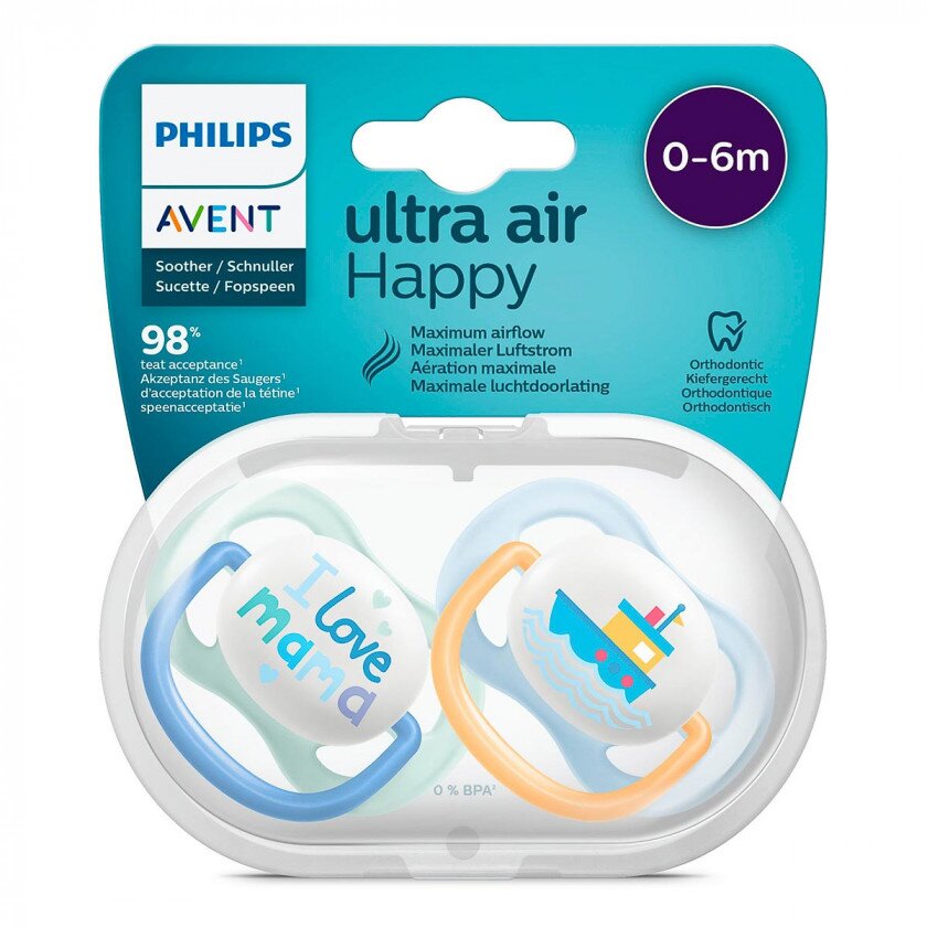 Особенности Пустышки Philips Avent Ultra Air I Love 0-6 мес 2 шт: в упаковке 2 шт.; увеличенные отверстия позволяют коже малыша дышать; ортодонтическая, повторяет естественную форму неба, зубов и десен; без бисфенола-А, высококачественный силикон, из которого изготовлена пустышка, не имеет вкуса, запаха и абсолютно безопасен для малыша; большие отверстия для воздуха бережно проветривают кожу малыша, обеспечивая ее мягкость и сухость; идеальная текстура для полного комфорта, пустышка с приятной на ощупь соской создана для легкого и комфортного использования; 98 % опрошенных мам сказали, что ребенок легко принимает пустышки Philips Avent Ultra Soft и Ultra Air.