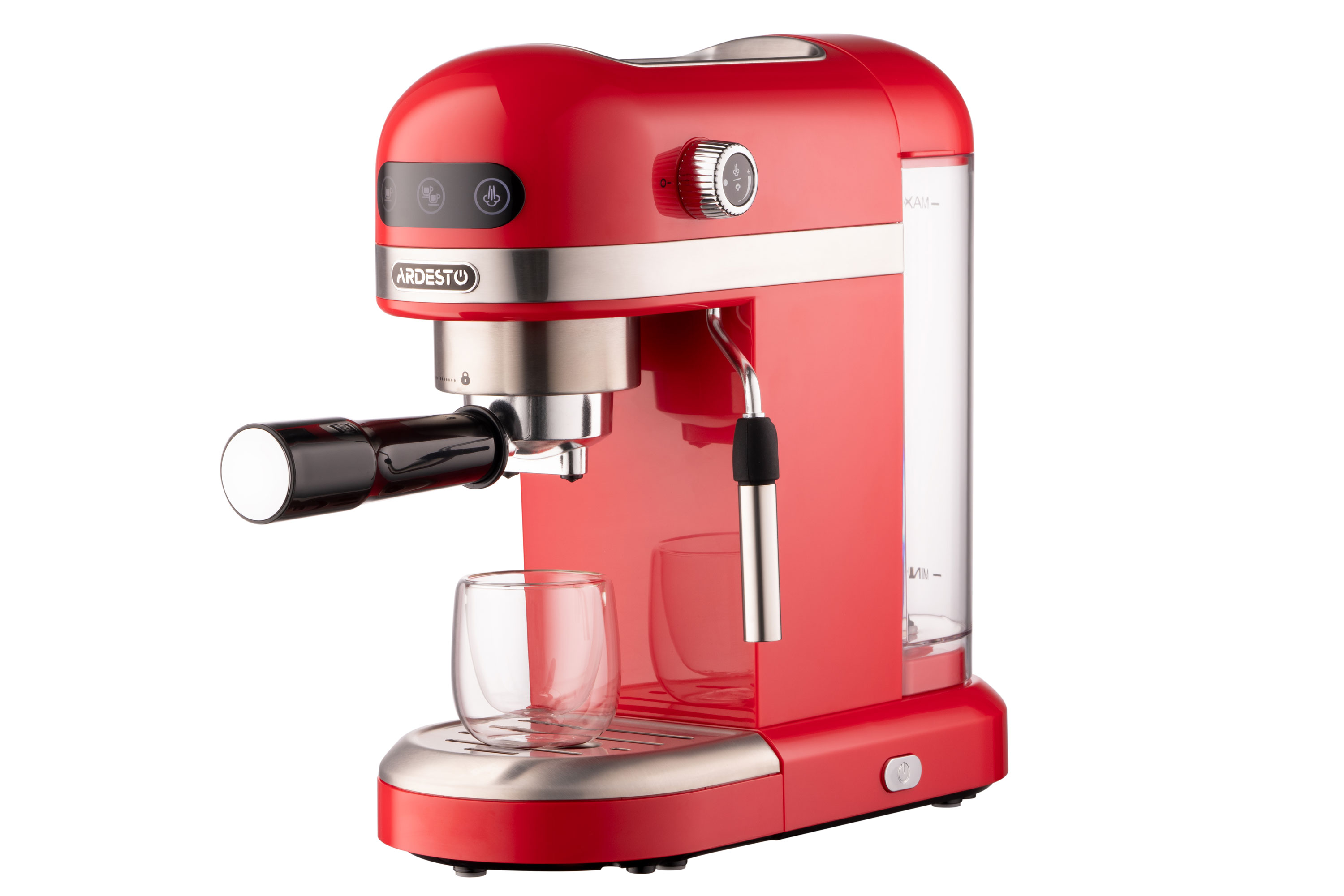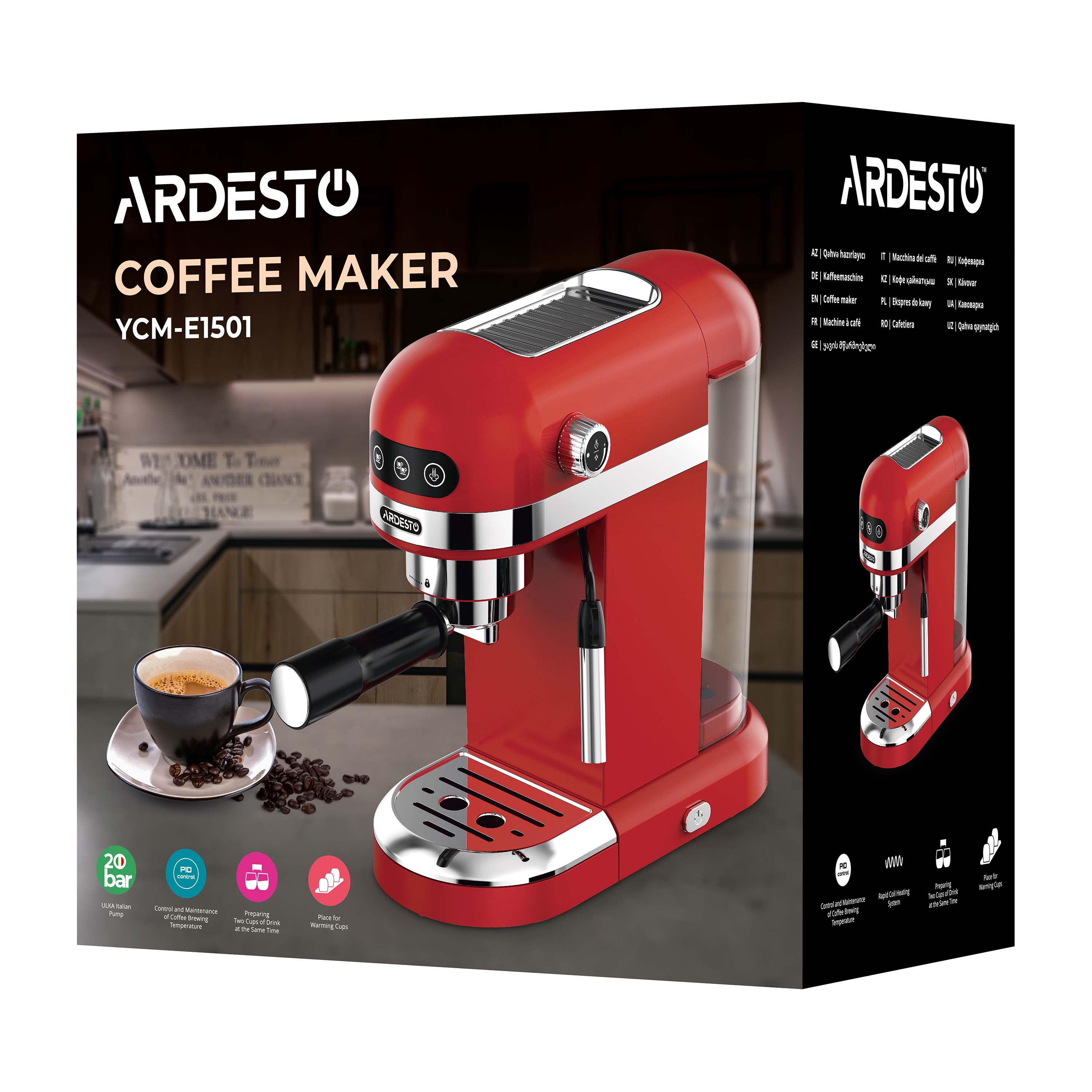 Взбодриться с утра поможет рожковая кофеварка ARDESTO YCM-E1501, выполненная в ярком красном цвете, она удачно подчеркнет экстравагантный стиль владельца. Модель может похвастаться мощностью (1350 Вт) и хорошими техническими характеристиками, среди которых: большой объем резервуара для воды, капучинатор, цифровой термостат для контроля температуры заваривания, функция предварительного замачивания кофе и т. д.