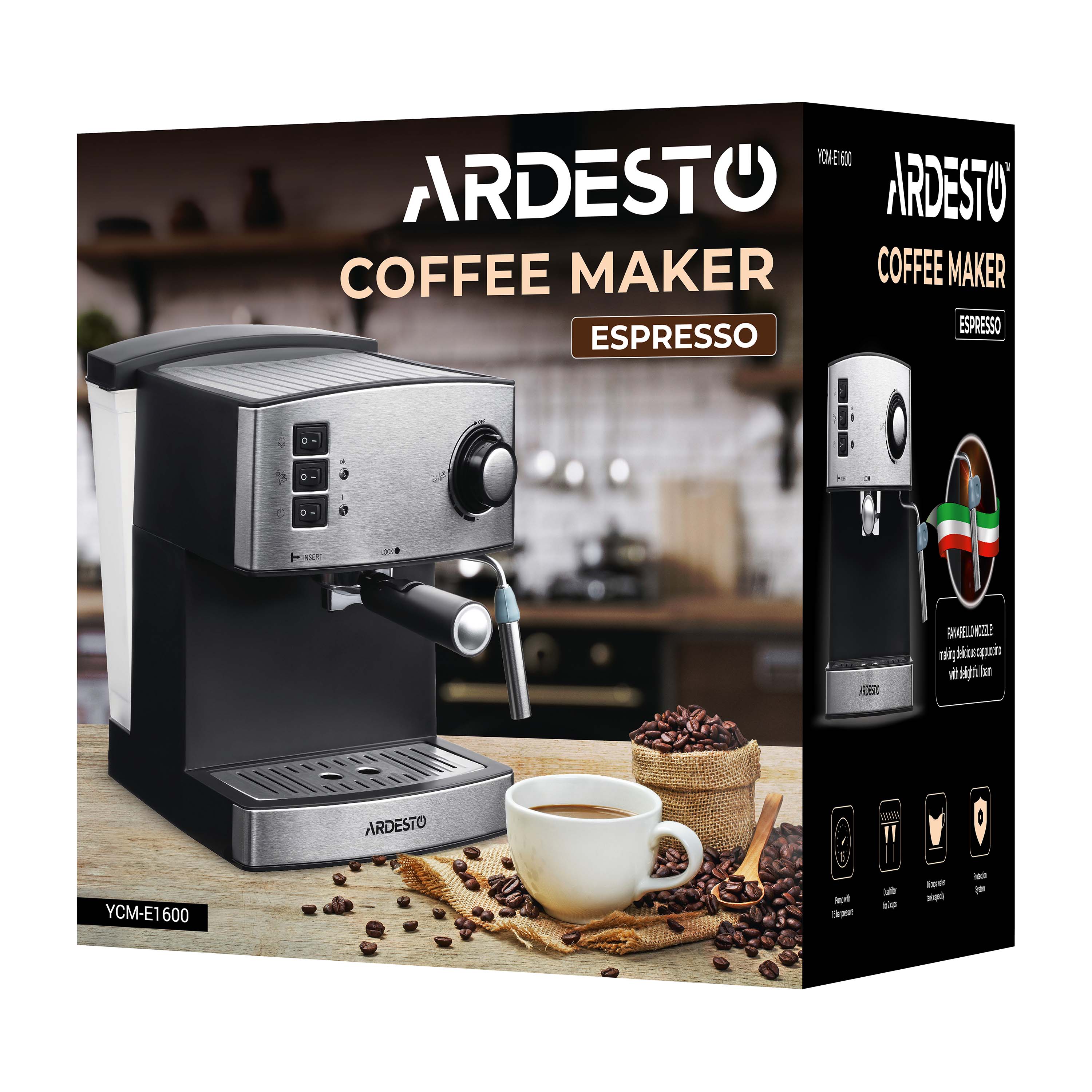 Рожковая кофеварка мощностью 850 Вт для приготовления эспрессо из молотого кофе. Кофеварка YCM-E1600 оснащена двойным фильтром, помпой итальянского производства и механическим капучинатором с насадкой панарелло.