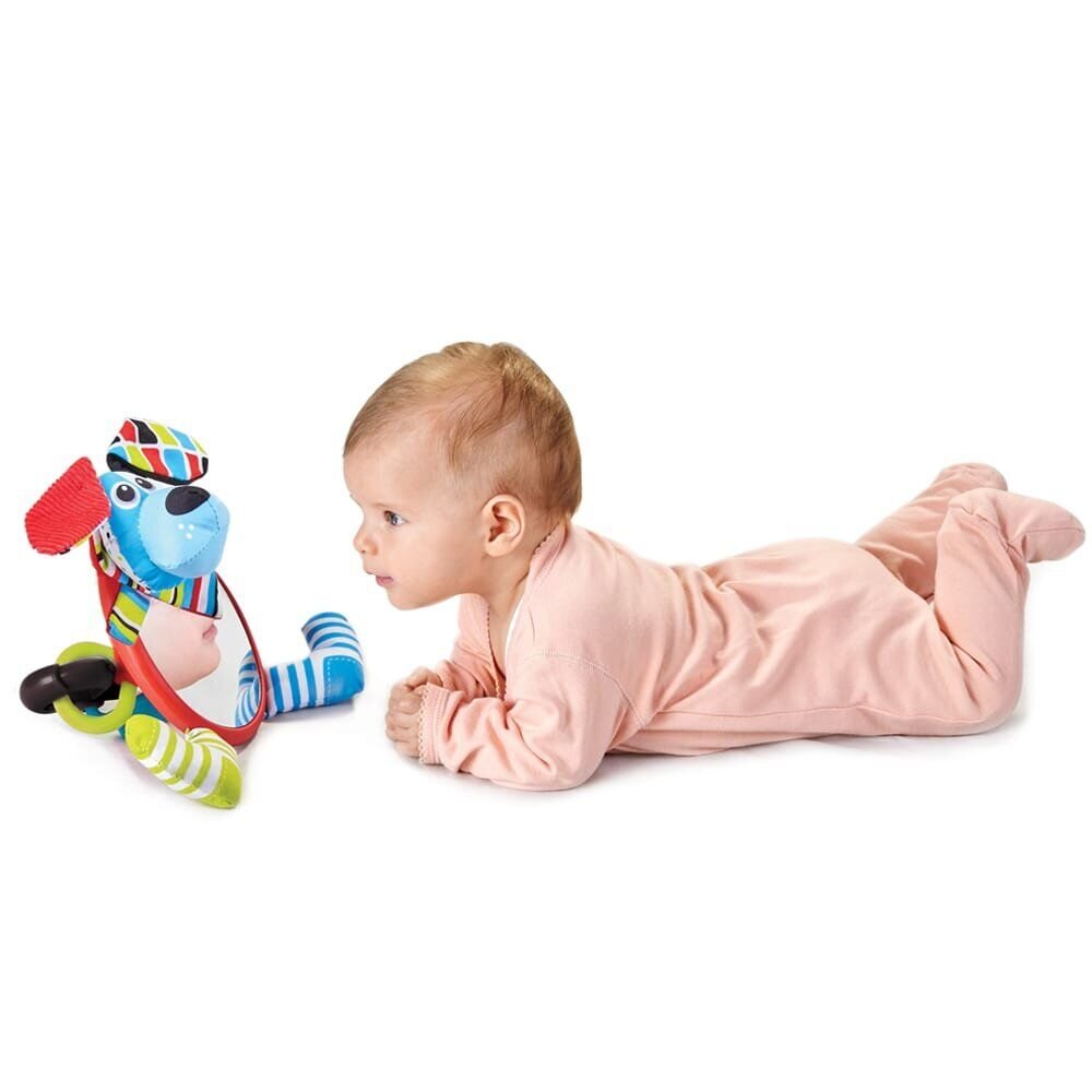 Прикрепленное на козырек коляски, оно превращается в интересный мобиль, в котором малыш сможет периодически видеть себя или любоваться очаровательным игрушечным песиком. Поставленное на горизонтальную поверхность, оно поможет вам с ребенком в игровой форме изучать строение тела. Кроме того, такое приобретение станет отличным дополнением интерьера детской комнаты.