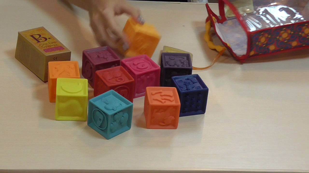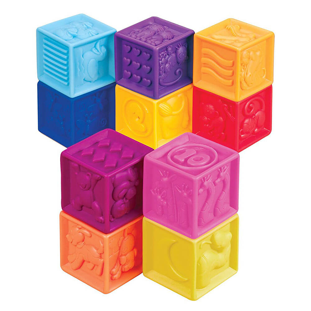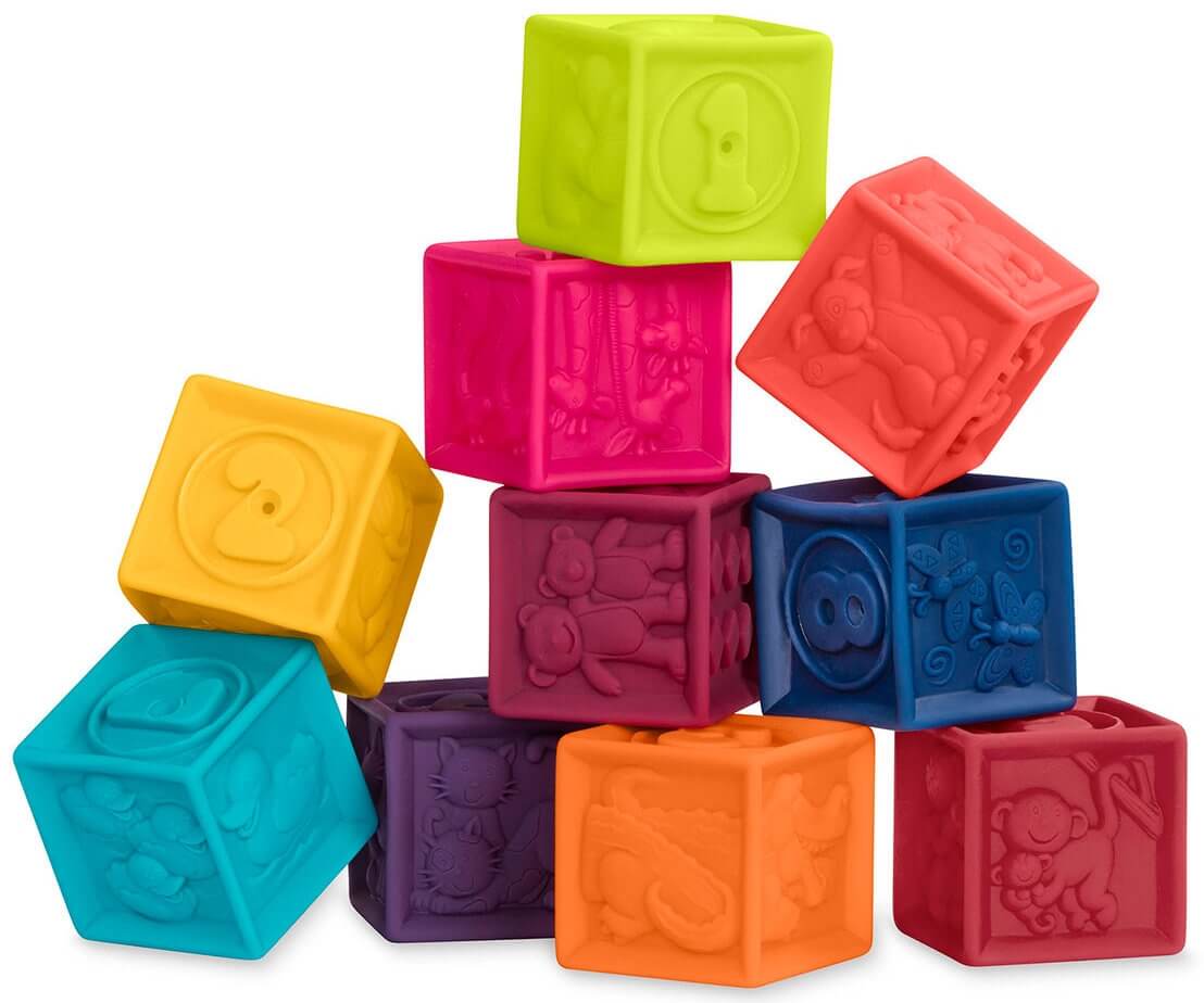 Десять супермягких и суперярких кубиков от Battat созданы специально для маленьких детских ручек. Все стороны кубиков абсолютно разные, на них изображены цифры от 1 до 10, дружелюбные зверушки и другие забавные картинки. Кубики можно грызть, сжимать, бросать и даже купаться с ними в ванной. Различные текстуры на гранях кубиков помогут развить мелкую моторику и тактильные ощущения ребенка. А еще кубики забавно пищат при сжимании!