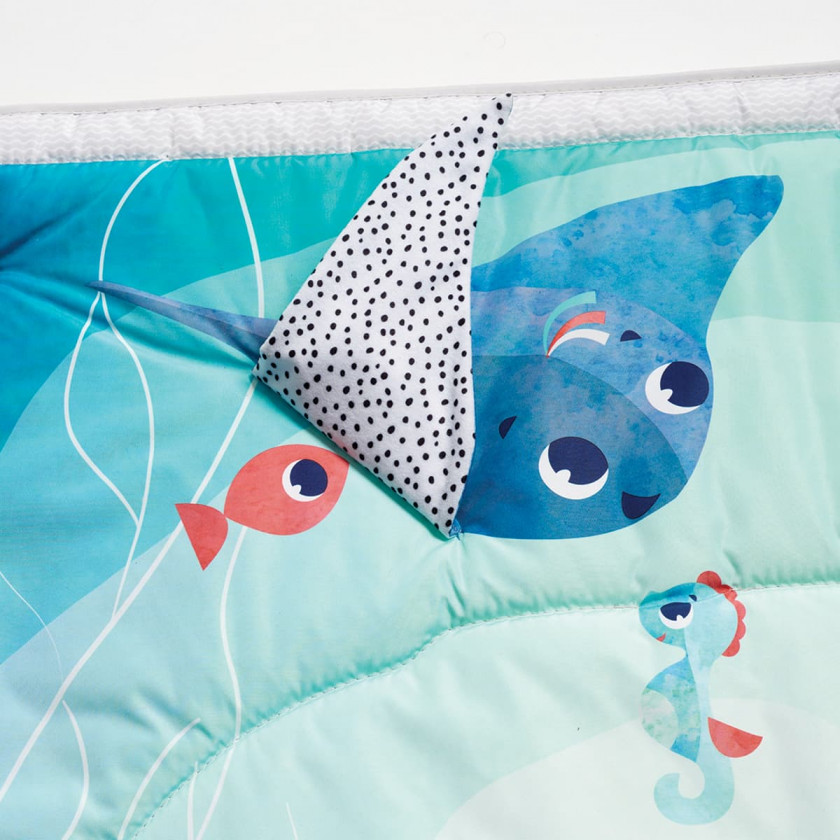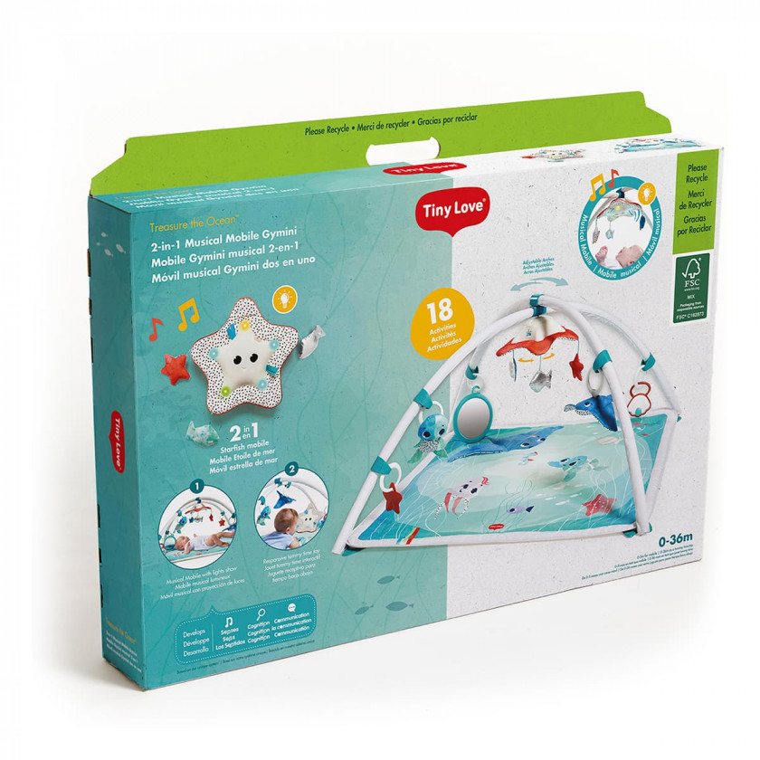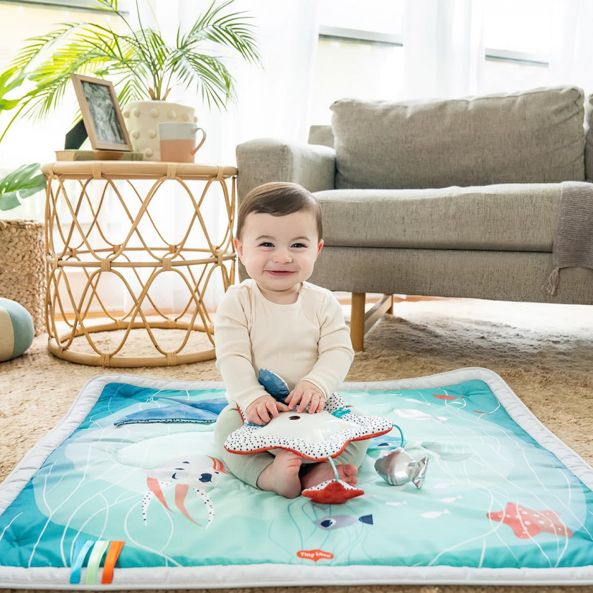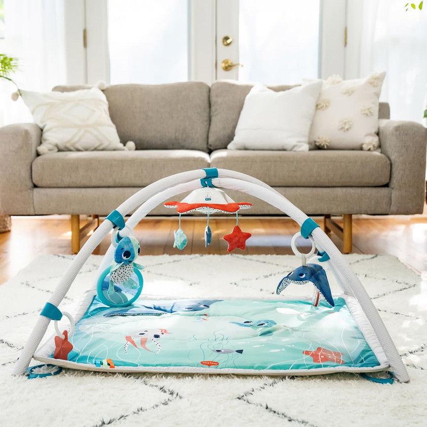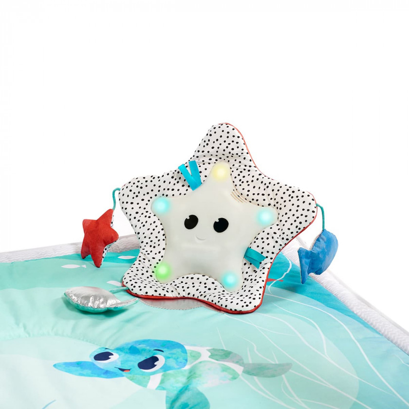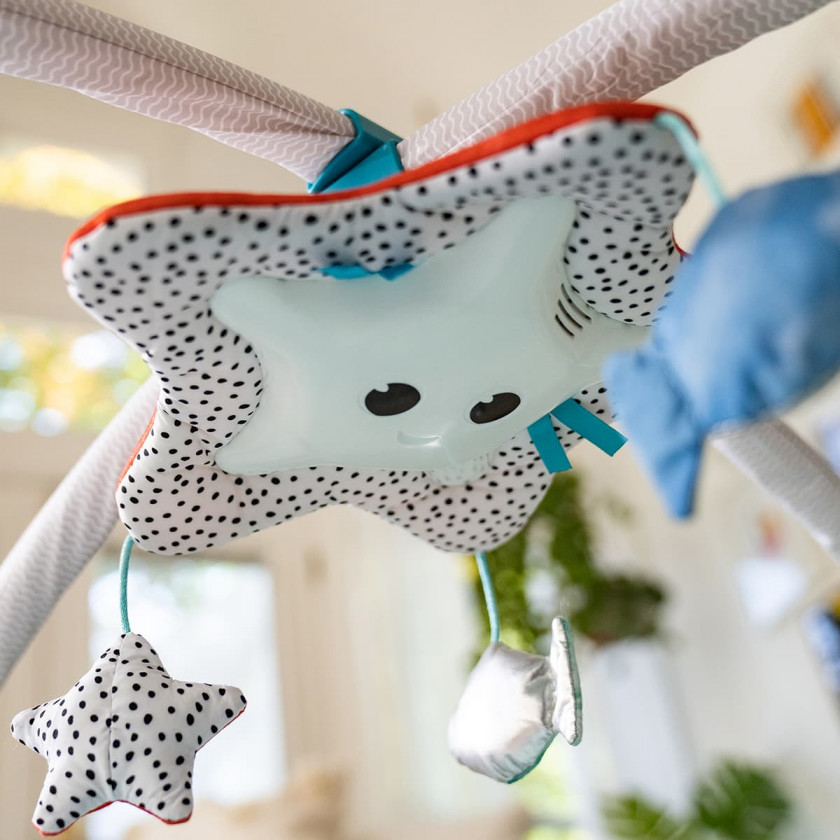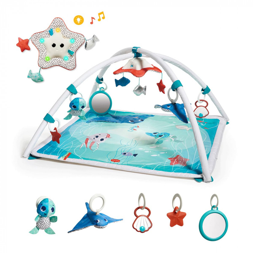 Особенности развивающего коврика с дугами Tiny Love Океан: комплектация: коврик, 2 дуги, 6 развивающих игрушек: звездочка с подсветкой и музыкой, погремушка кит, погремушка черепашка, грызунок ракушка, грызунок звездочка, зеркальце игровое; музыкальная игрушка морская звезда с LED подсветкой имеет 6 мелодий, эффект затемнения подсветки и таймер; 2 варианта расположения музыкальной игрушки: подвесив на дуги или на игровом пространстве коврика; дуги изменяют положение для разнообразия игр; уход: машинная стирка; тип питания: 3 х АА/LR6 (1,5V) (в комплект не входят); 18 активностей на коврике поддерживают физическое, когнитивное и эмоциональное развитие.