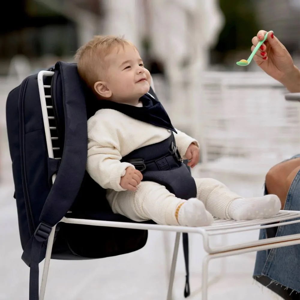 Откройте спинку, откиньте накладку для детского сиденья и прикрепите боковые пряжки, чтобы превратить любую парковую лавку или стул на удобное детское кресло.