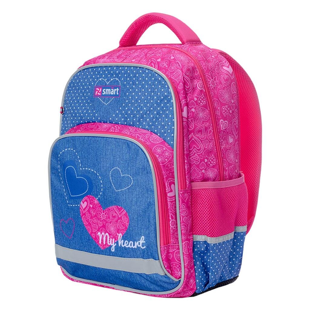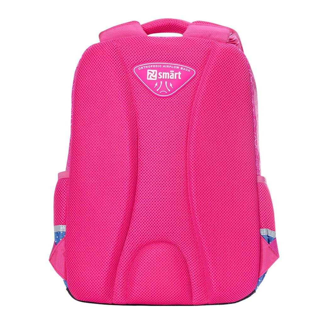 Школьный рюкзак на два отделения. Три кармана: один с молнией на фронтальной стороне, два по бокам. В основном отделении - разделитель для тетрадей. Анатомическая спинка. Анатомические, S-образной формы лямки. Нагрудный ремень. Дно усилено пластиковой вставкой. Мягкая уплотненная ручка, ручка петля для розмещенная на крючке. Размер: 42 х 30 х 18 см.