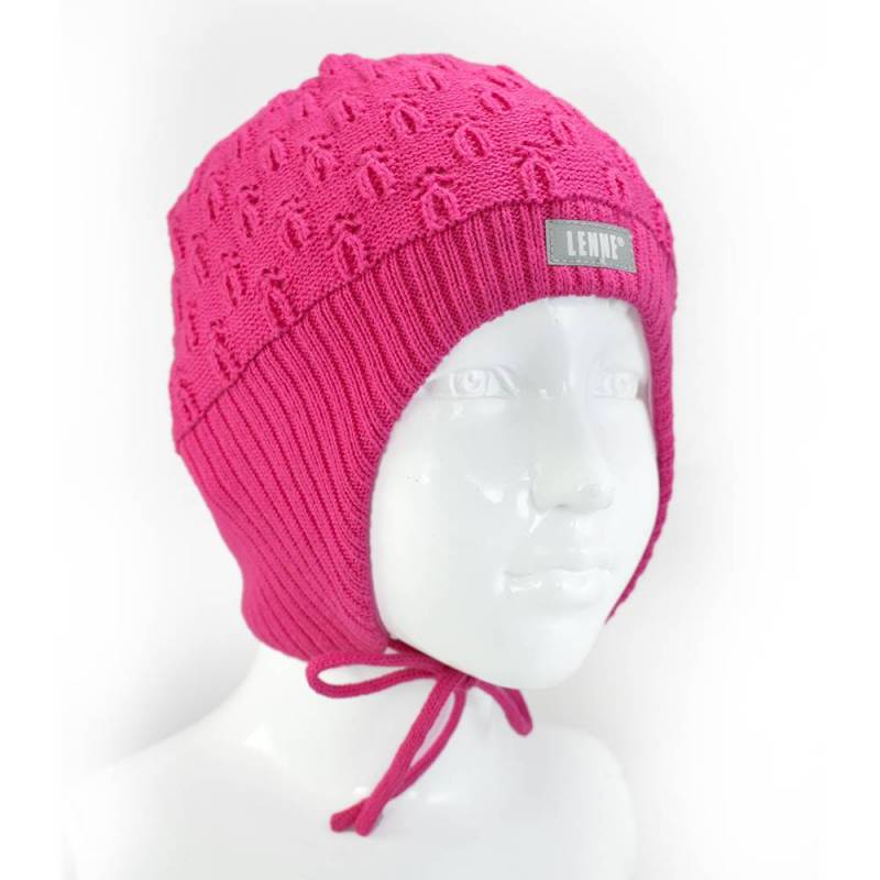 Вязаная шапка с трикотажной подкладкой для малыша 5-6 лет. Есть защита ушей ребенка от ветра, завязки. Состав: 100% хлопок. Цвет – малиновый. Рельефная вязка.