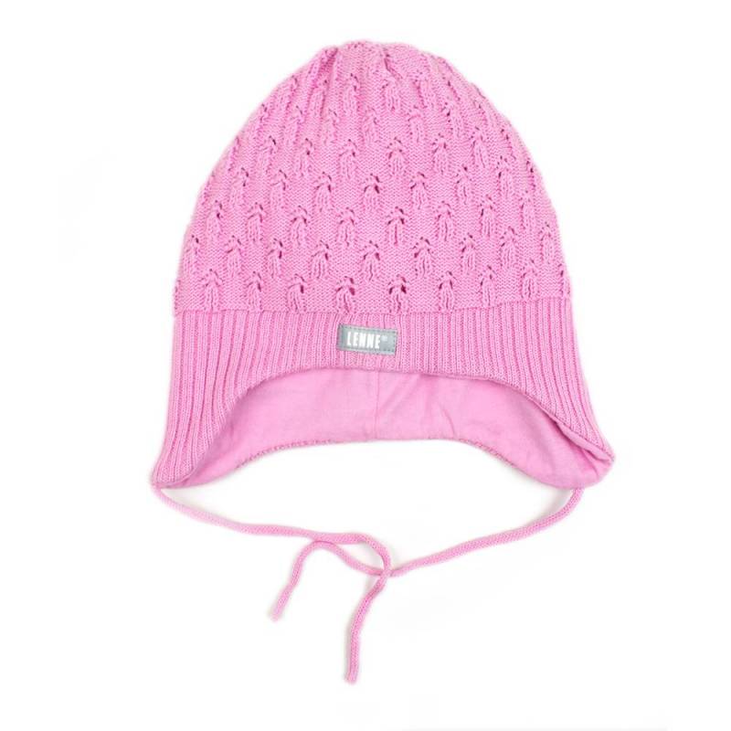 Вязаная шапка с трикотажной подкладкой для малыша 3-4 лет. Есть защита ушей ребенка от ветра, завязки. Состав: 100% хлопок. Цвет – розовый. Рельефная вязка.