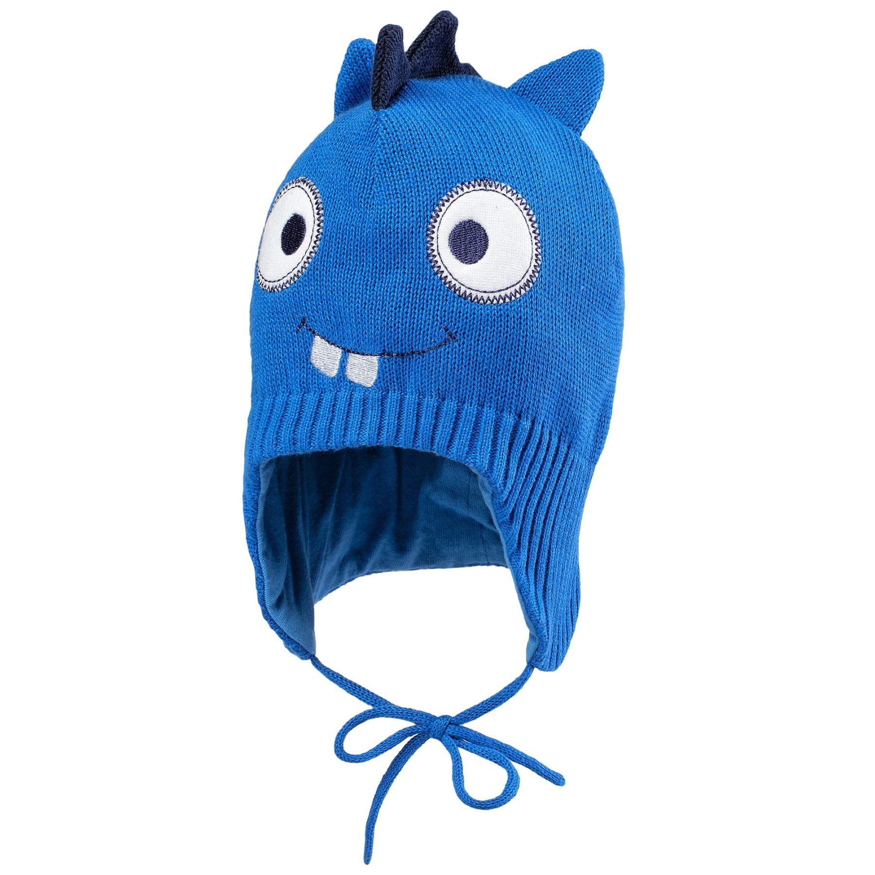Трикотажная демисезонная шапка с подкладкой для малыша 3-4 лет. Есть защита ушей ребенка от ветра, завязки. Украшена двумя "ушками", вышивкой в виде забавной мордочки. Состав: 100% хлопок. Цвет – синий.