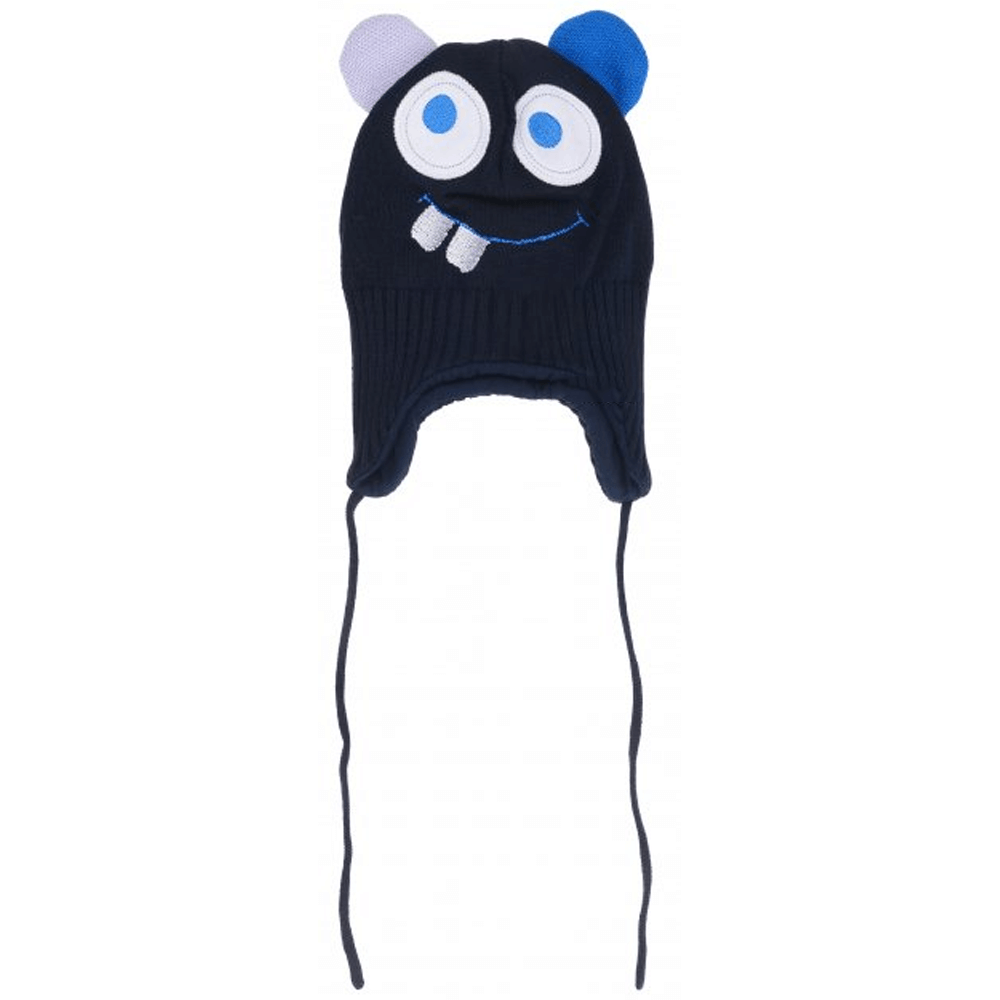 Трикотажная демисезонная шапка с подкладкой для малыша до года. Есть защита ушей ребенка от ветра, завязки. Украшена двумя "ушками", вышивкой в виде забавной мордочки. Состав: 100% хлопок. Цвет – темно-синий.