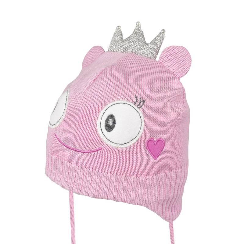 Трикотажная демисезонная шапка с подкладкой для малыша 3-4 лет. Есть защита ушей ребенка от ветра, завязки. Украшена двумя "ушками" и "короной", вышивкой в виде забавной мордочки принцессы. Состав: 100% хлопок. Цвет – розовый.