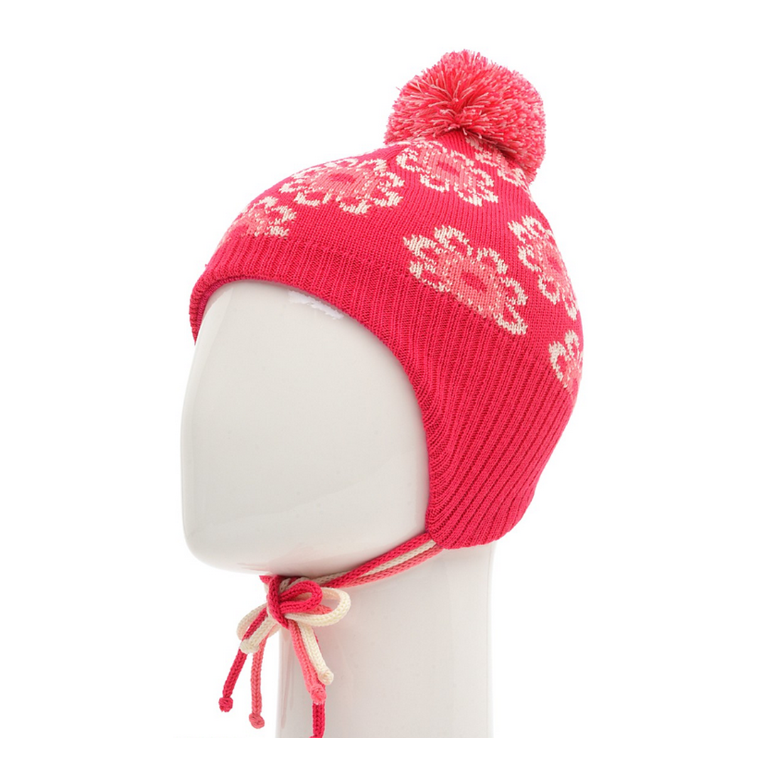 Вязаная зимняя шапка на подкладке для девочки 5-6 лет. Имеет завязку, защиту для ушей. Украшена помпоном. Цвет – красный. Цветочный принт.