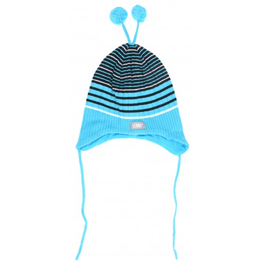 Трикотажная демисезонная шапка с подкладкой для малыша 3-4 лет. Есть защита ушей ребенка от ветра, завязки. Украшена двумя бубонами, полосками. Состав: 100% хлопок. Цвет – бирюзовый.