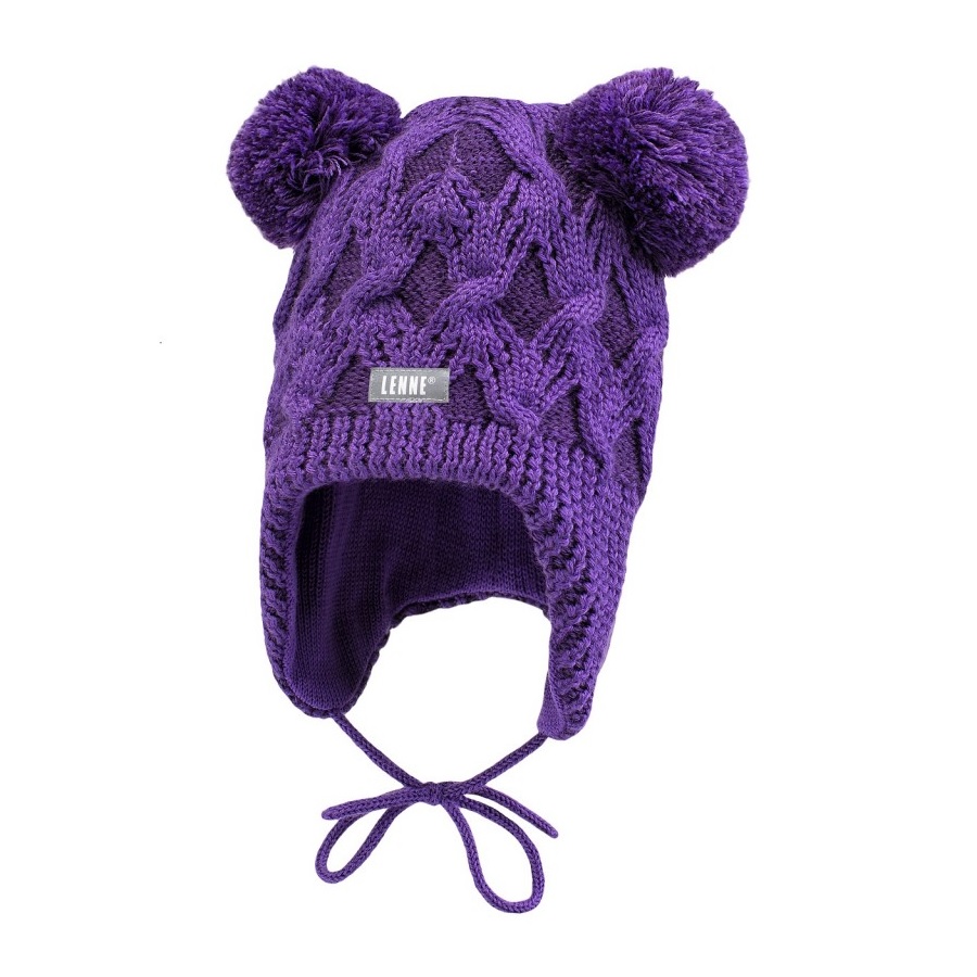 Вязаная теплая шапка с хлопковой подкладкой для малыша от рождения до 12 месяцев. Есть защита ушей ребенка от ветра, завязки. Украшена помпонами. Состав: 50% шерсть, 50% акрил. Цвет – фиолетовый. Рельефная вязка.