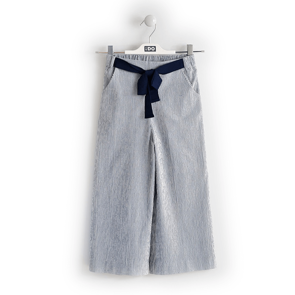 Широкие укороченные брюки "кюлоты" из эффектной ткани с металлическим напылением. Сзади на талии присборены на резинке. На талии фиксируются темно-синим поясом-лентой. Имеют два врезных боковых кармана. Состав: 92% хлопок, 6% полиэстер, 2% эластан.