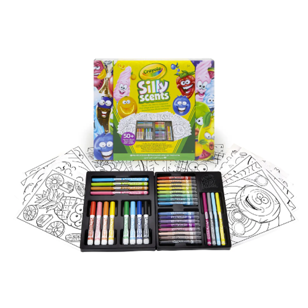 Пришло время для веселья и творчества с мини арт-студией Silly Scents™ от Crayola! В этом наборе разноцветные маркеры и восковые мелки, которые имеют яркие цвета и уникальный аромат для каждого цвета. Кроме того, набор из 20 раскрасок с забавными персонажами, которые представляют каждый из существующих ароматов. Все элементы упакованы в красочный художественный футляр.