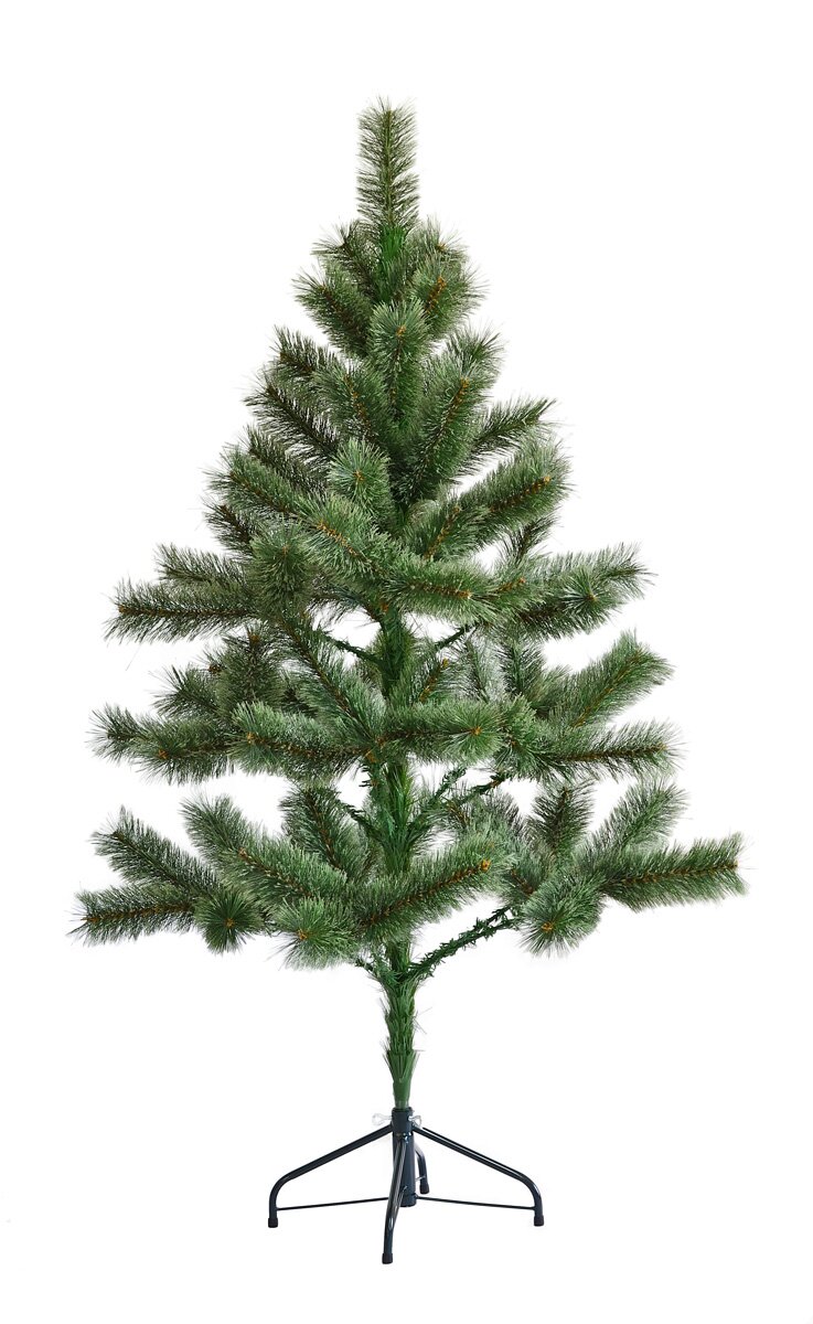 Материал: ПВХ пленка шириной 10 см; металл; проволока. Высота: 150 см. Диаметр нижнего ряда: 96 см. Ствол состоит из двух частей. Подставка сосны — это металлическая крестовина с болтами, закрепляющими ствол.
