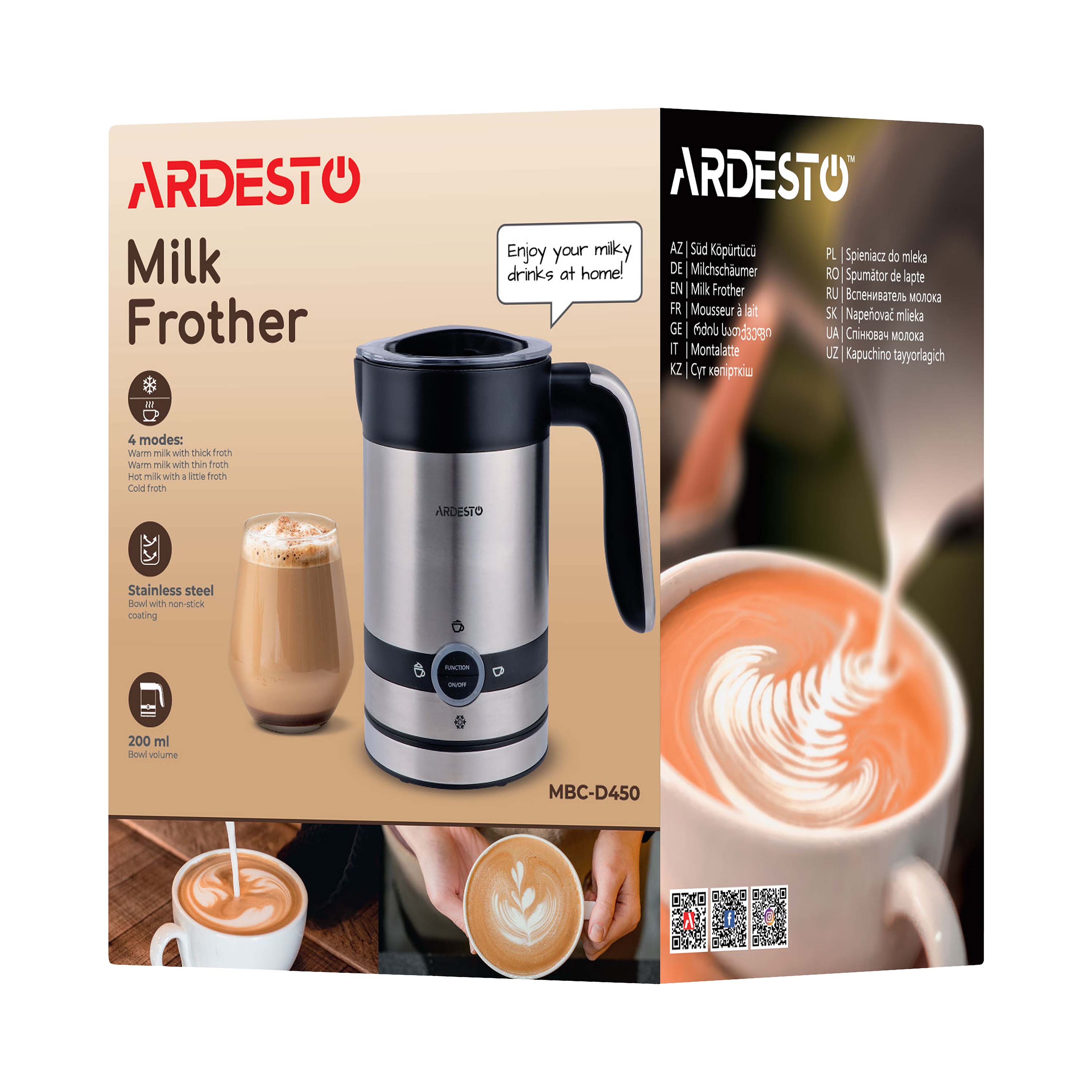 Вспениватель молока ARDESTO MBC-D450 (капучинатор) – это компактное и эффективное устройство для приготовления устойчивой молочной пены для любимых напитков. Изготовленная из нержавеющей стали, модель серебристо-черного цвета не только удачно впишется в любой интерьер кухни, но и прослужит длительное время. Вспениватель отличается высокой мощностью (450 Вт) – возможность сбивать идеальную пену в считанные минуты.