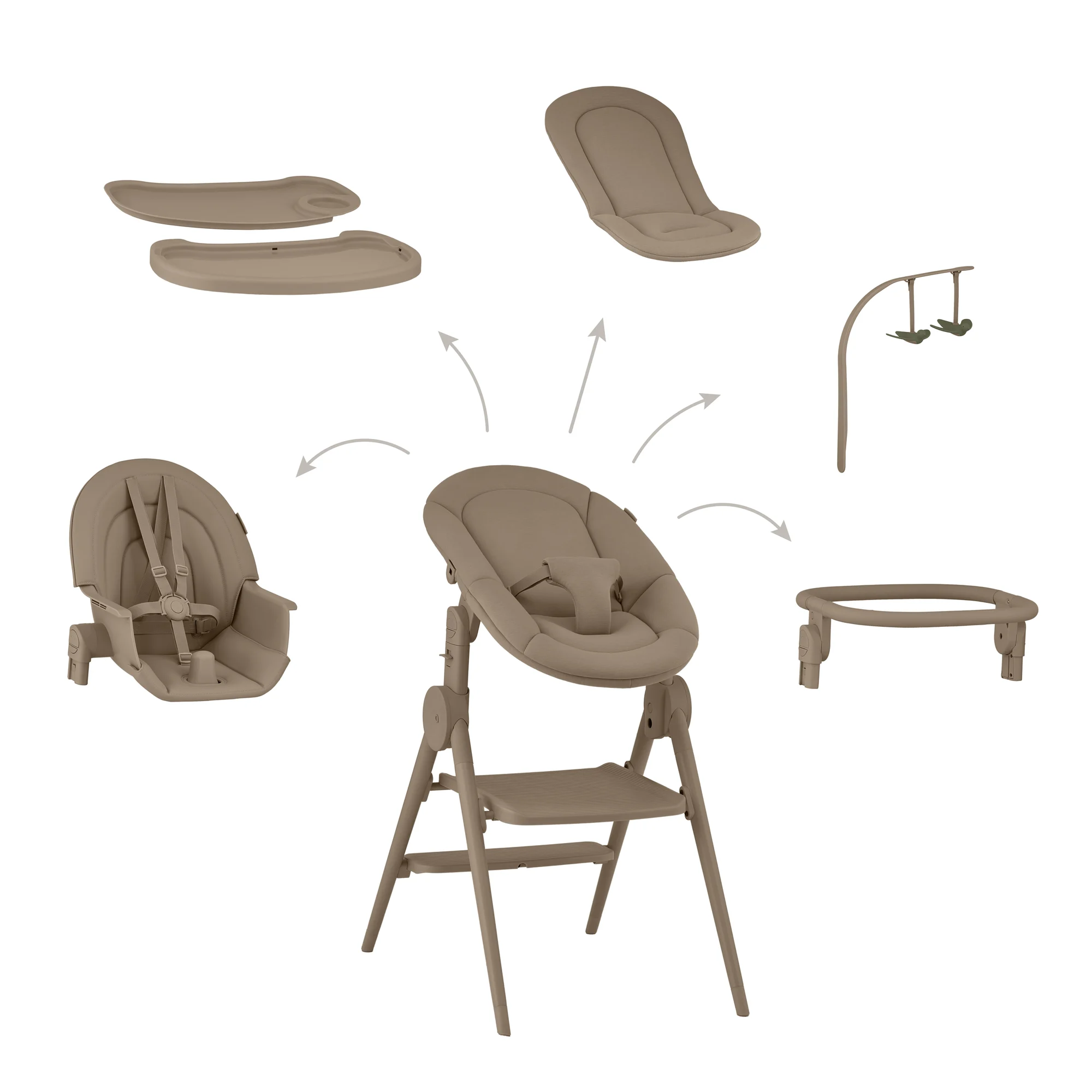 - стульчик для кормления (6–36 мес.) — с регулируемой спинкой, подножкой, пятиточечными ремнями и съёмным подносом с легкоочищающейся накладкой;
