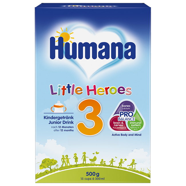 Соответствует международным стандартам качества. Продукт доступен в весе 500 г 500 г сухой смеси = 24 порции готовой смеси Humana 3 по 200 мл готовой