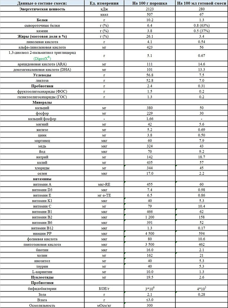 Digest X — комплекс жиров с бета-пальмитатом для комфортного пищеварения, состоит из триглицеридов особой структуры, способствует снижению частоты и интенсивности запоров, лучшему энергообмену и усвоению кальция. Пребиотики и Пробиотики — комбинация пребиотиков (галактоолигосахариды + фруктоолигосахариды) и пробиотиков (живые бактерии Bifidobacterium BB-12) способствует здоровому пищеварению. DHA и ARA — докозогексаеновая (омега-3) и арахидоновая (омега-6) кислоты – ценнейшая комбинация пищевых веществ, важная для правильного развития мозга и зрения. 5 Нуклеотидов – пищевые ингредиенты, способствующие укреплению иммунитета.