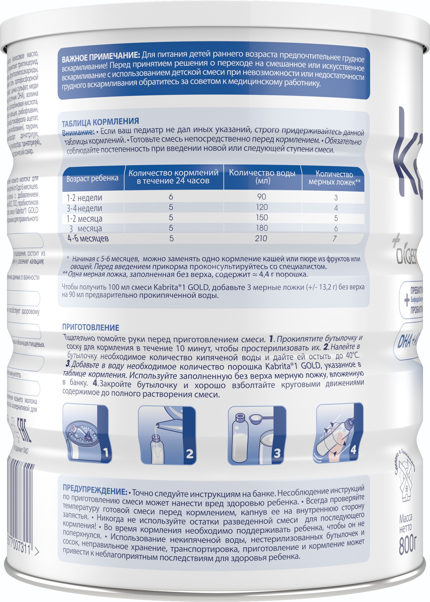 Приготовление: Прокипятите бутылочку и соску для кормления в течение 10 минут, чтобы простерилизовать их. Налейте в бутылочку необходимое количество кипяченой воды и дайте ей остыть до 40°С. Добавьте в воду необходимое количество порошка Kabrita® 1 GOLD, указанное в таблице кормления (см на банку). Используйте заполненную без верха мерную ложку, вложенную в банку. Закройте бутылочку и хорошо взболтайте круговыми движениями содержимое до полного растворения смеси. Чтобы получить 100 мл смеси Kabrita® 1 GOLD, добавьте 3 мерные ложки (+/- 13,2 г) без верха на 90 мл предварительно прокипяченной воды.