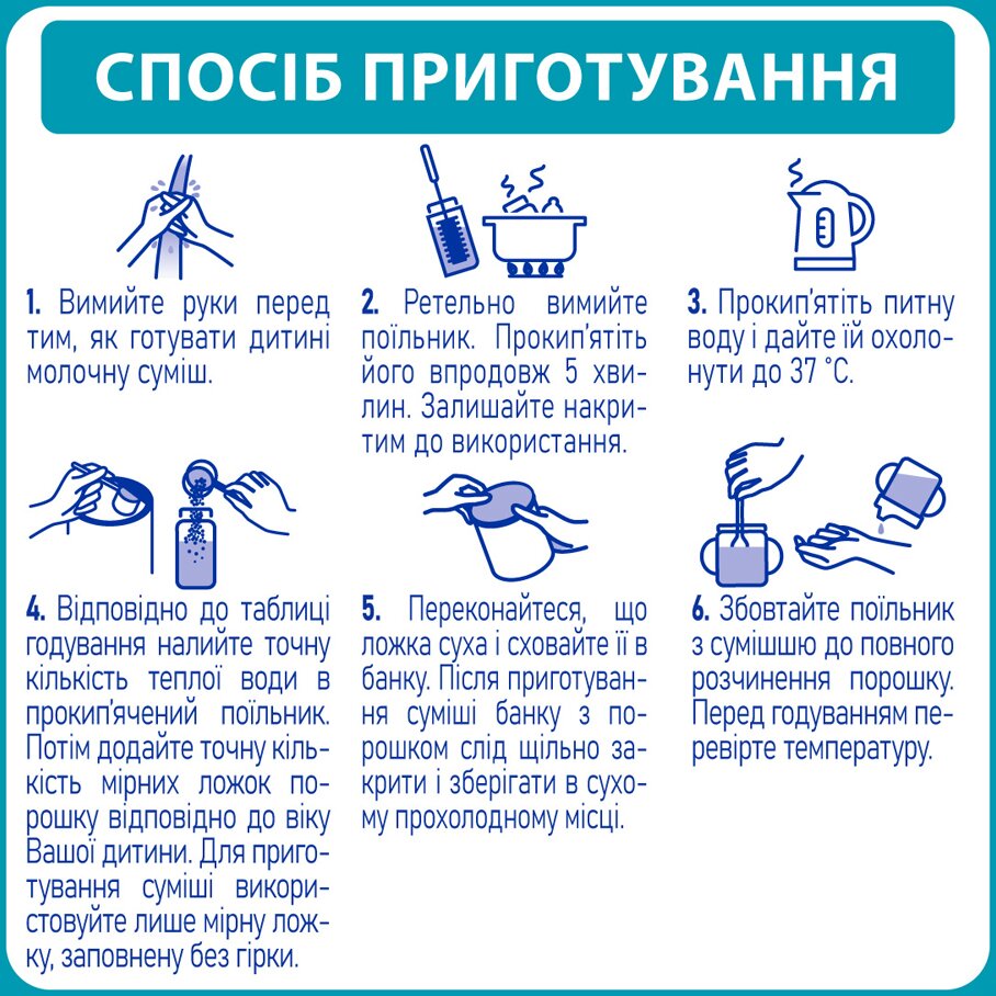 Инструкция по приготовлению: Вымойте руки перед тем, как готовить ребенку молочную смесь. Тщательно вымойте бутылочку, соску и крышку. Прокипятите их в течение 5 минут. Оставляйте накрытыми до использования. Прокипятите питьевую воду и дайте ей остыть до 37°C. Согласно таблице кормления налейте точное количество теплой воды в кипяченую бутылочку. Затем добавьте точное количество мерных ложек порошка в соответствии с возрастом Вашего ребенка. Для приготовления смеси используйте только мерную ложку, заполненную без горки. Убедитесь, что ложка сухая и спрячьте ее в банке. После приготовления смеси банку с порошком следует плотно закрыть и хранить в сухом прохладном месте. Закройте бутылочку и хорошо взболтайте до полного растворения порошка.