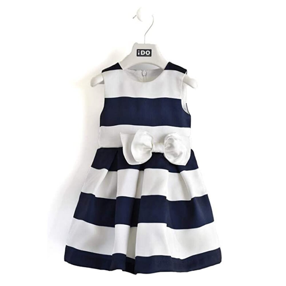Ваша девочка станет принцессой стиля в этом наряде iDO. Белое платье без рукавов, в широкую синюю полоску выполнено из фактурного атласа, что дает легкий эффект глянца. Юбка со встречными складками. Мягкая подкладка из 100% хлопка обеспечивает полный комфорт. Дополнительным украшением служит большой белый бант на талии. Застежка - скрытая молния на спине.