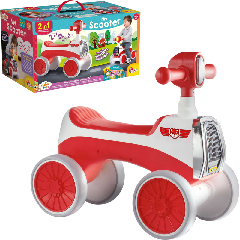 Lisciani Carotina Baby Rider – отталкивающие ножки красного цвета. Легкий, маневренный, будет хорошо работать как дома, так и на прогулках. Имеет руль и удобное сиденье. Он обеспечивает отличное развлечение, а также развивает чувство равновесия и общую моторику ребенка. Кроме того, в комплект входит картонная игра на память. Машинка имеет мелодии и световую иллюминацию.