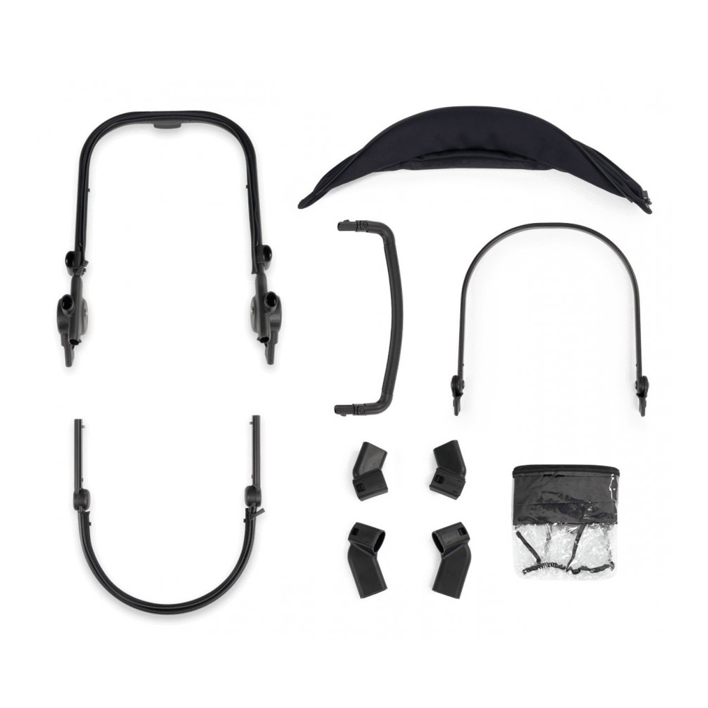 Комплект содержит адаптеры-преобразователи, устанавливаемые на раму коляски за пару кликов. Эти конвертеры позволяют установить дополнительное место для второго ребенка – люльку и/или сиденье.