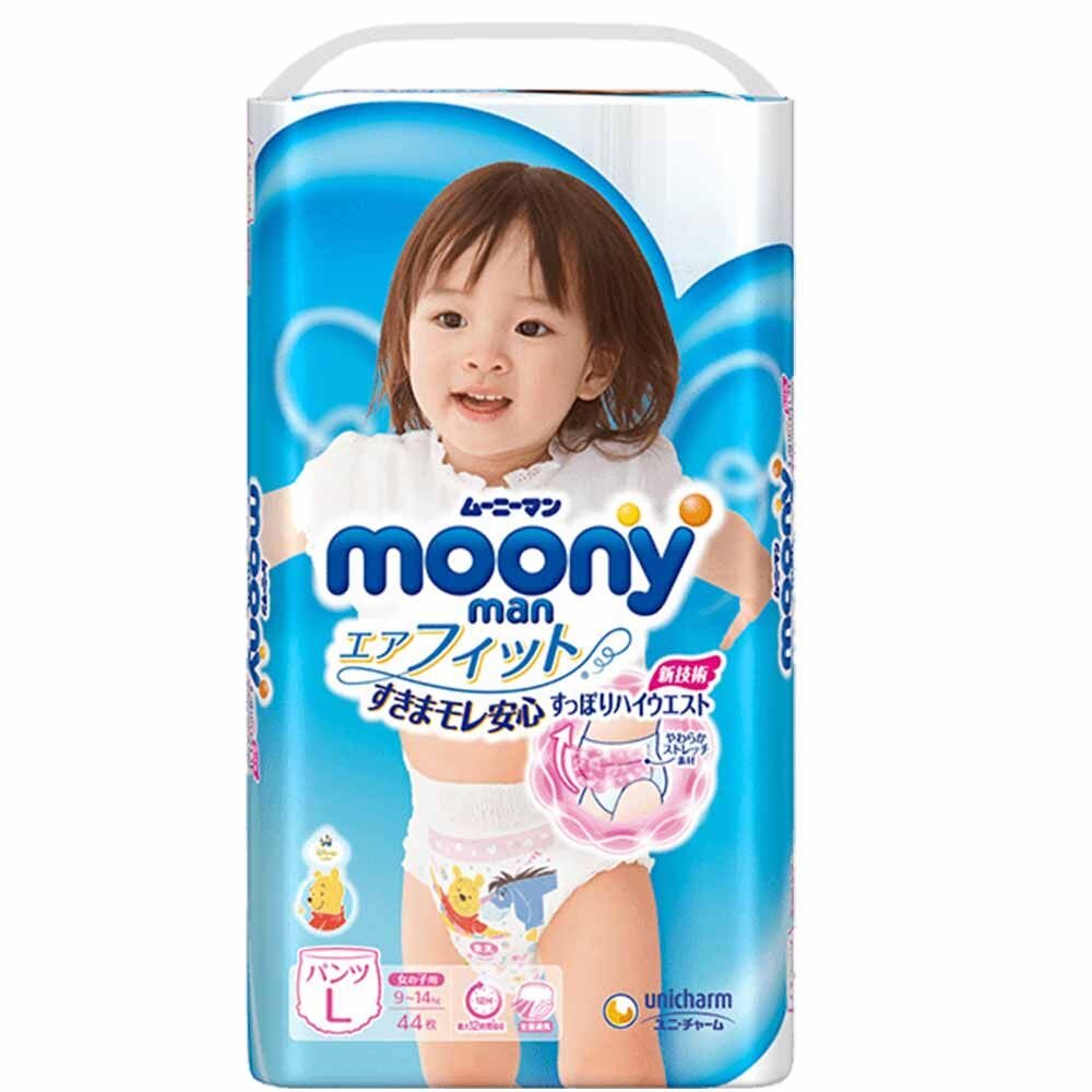 Подгузники трусики Moony на эластичном поясе предназначены для девочек весом 9-14 кг.
