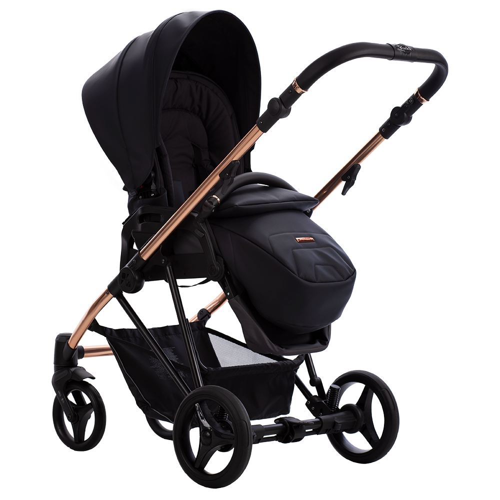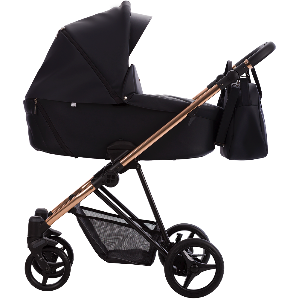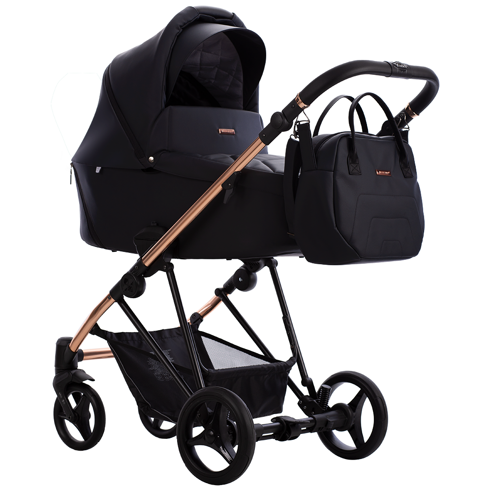 Коляска премиум-класса Yoddi 2в1 поставляется в экокожаной обивке на блестящей раме медного цвета. Медные элементы в ручке и бампере соответствуют цвету рамы и придают коляске дополнительную привлекательность.