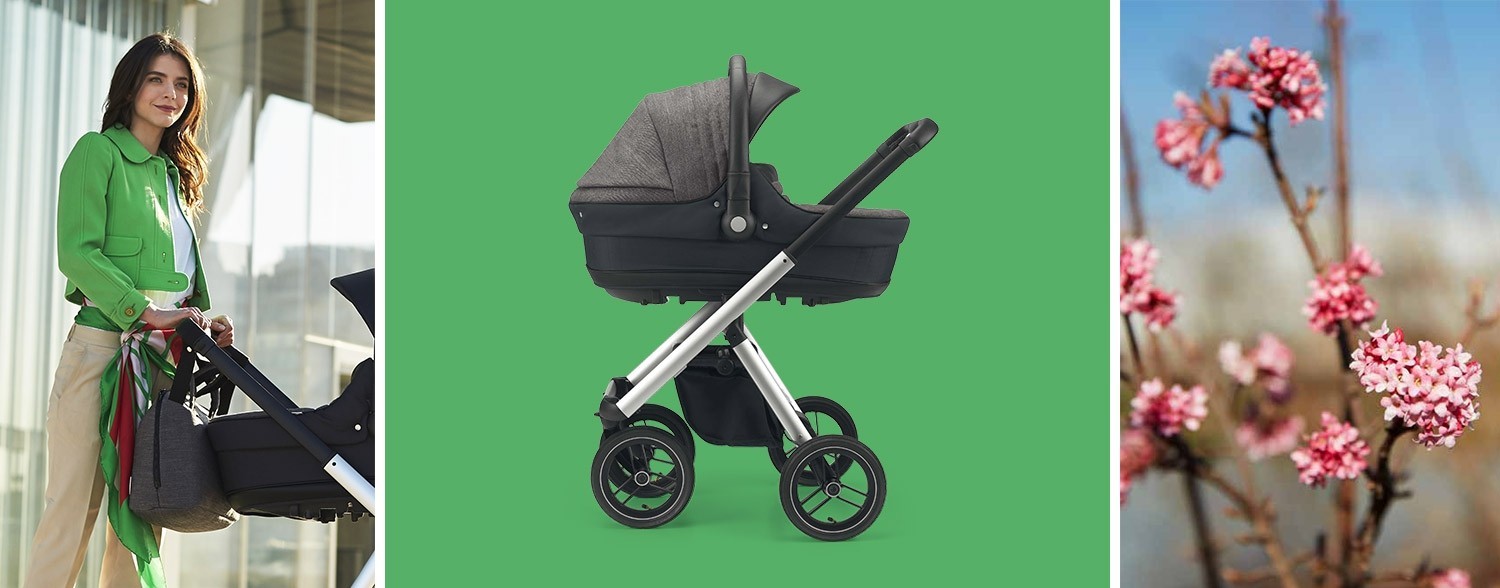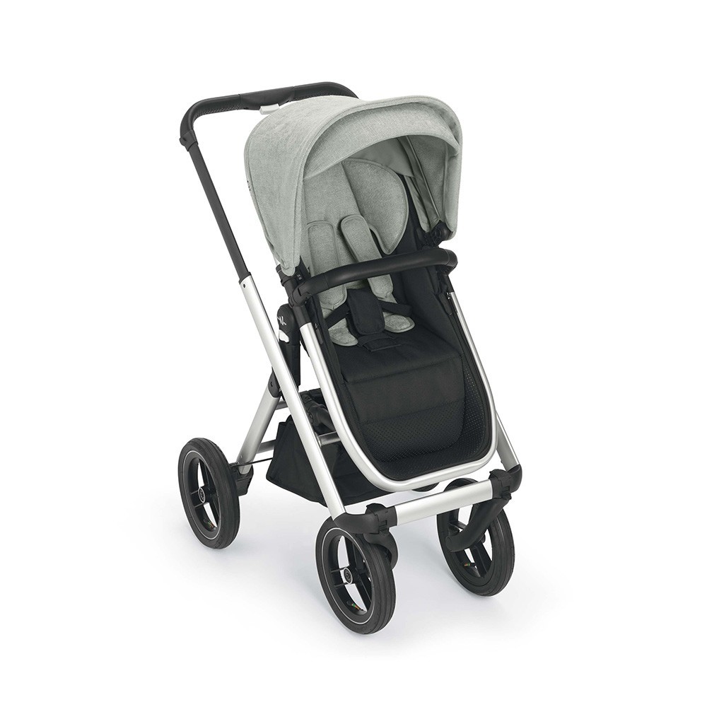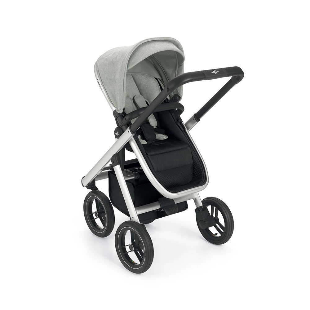 Шасси: Лёгкая и прочная алюминиевая рама. Легко складывается «книжкой». В сложенном виде может стоять без опоры. Оснащено системой амортизации. Удобная телескопическая ручка регулируется по высоте в 3-х положениях; ручка обтянута эко-кожей. Шасси – четырехколесное; большие надувные колеса. Передние колеса вращаются на 360 градусов, при необходимости фиксируются. Задние колеса блокируются при помощи тормоза. Все колеса можно снять. Вместительная корзина.