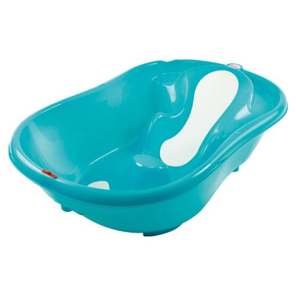 Ванночка для купания с анатомической горкой, которая удерживает ребенка в идеальном для купания положении, не позволяет ему соскользнуть под воду. В стенку ванночки встроен определитель температуры, автоматически изменяющий показания соответственно остыванию или нагреванию воды.