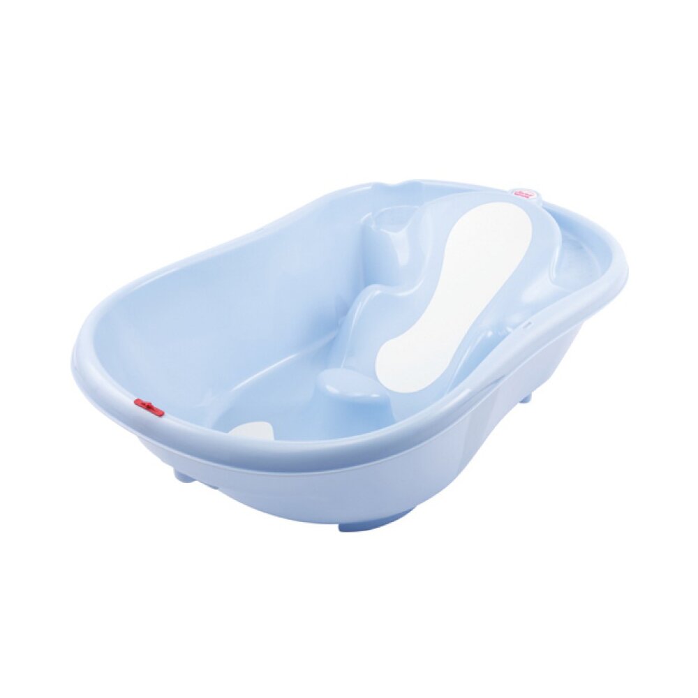 Ванночка для купания с анатомической горкой, которая удерживает ребенка в идеальном для купания положении, не позволяет ему соскользнуть под воду. В стенку ванночки встроен определитель температуры, автоматически изменяющий показания соответственно остыванию или нагреванию воды.
