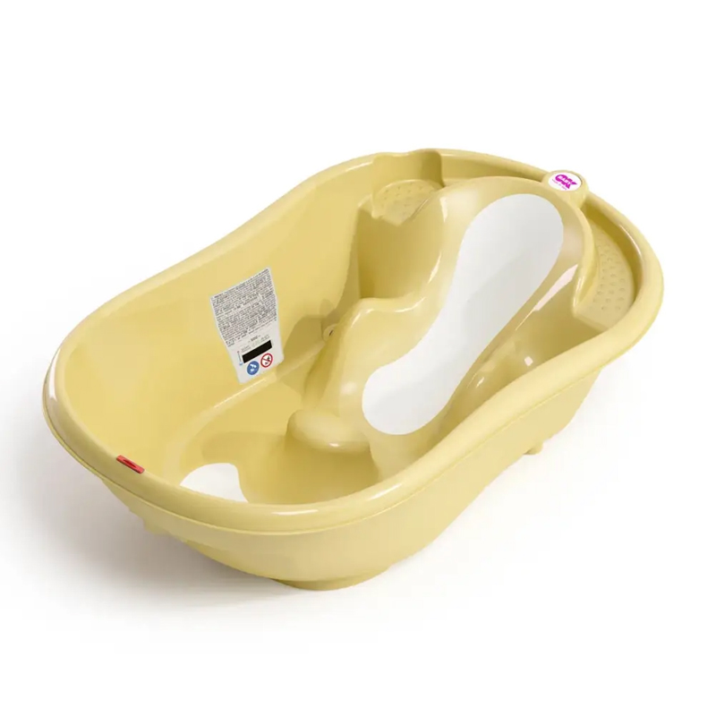 Пластиковая детская ванночка с анатомической горкой для удобного расположения младенца во время купания. Оснащена термодатчиком для контроля температуры воды. Имеет отдел для губки и мыла, сливное отверстие. Габариты ванночки - 26 x 53 x 93 см. Рекомендована детям от рождения до 12 месяцев.