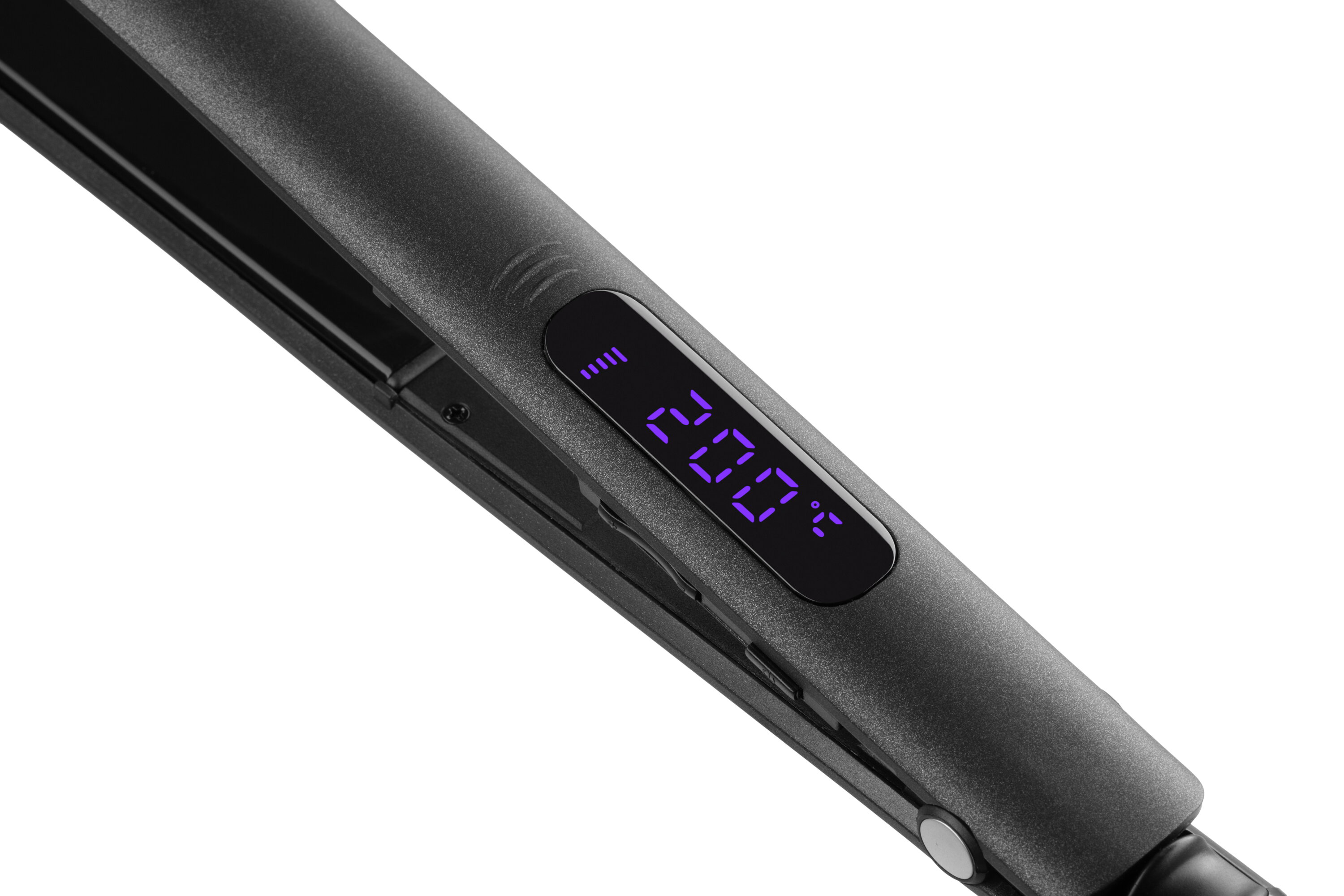 Плойка черного цвета с керамическим покрытием и электронным управлением для выпрямления волос и создания локонов.