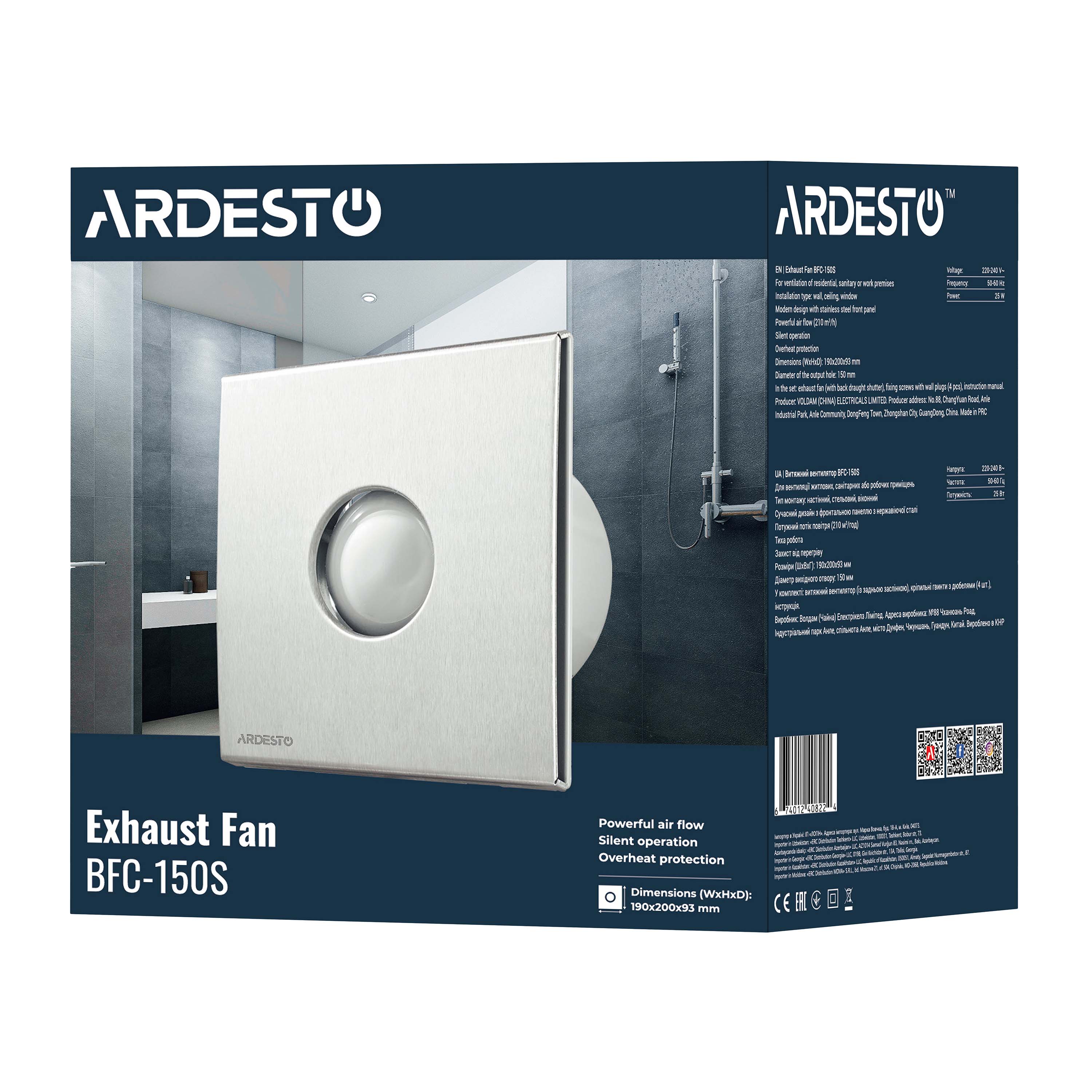 ARDESTO BFC-150S – эффективный вытяжной вентилятор мощностью 25 Вт и продуктивностью 210 м³/час. Модель имеет максимальную скорость вращения 1 650 об./мин и низкий уровень шума (35 дБ). Пригодится для монтажа на потолок или стену. Выполнен в сдержанном серебристом цвете, поэтому будет подходить к любому интерьеру.