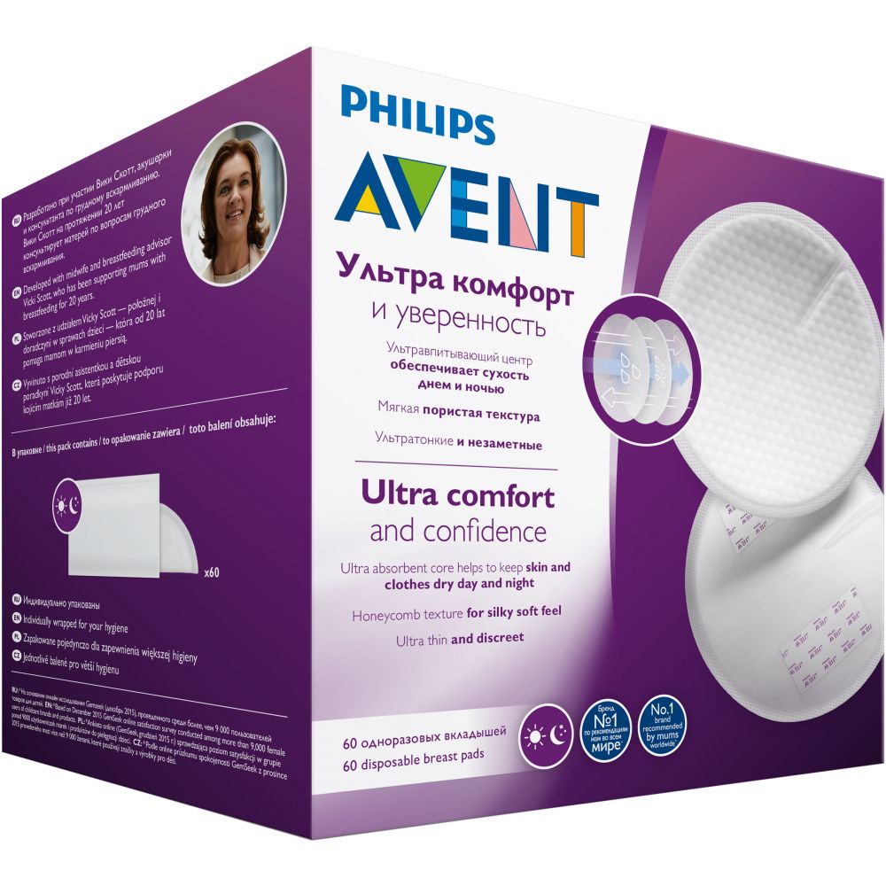 Вкладыши для бюстгальтера в количестве 60 шт. — это способ кормящей маме чувствовать себя комфортно. Продукт изготовлен из трёхслойного ультравпитывающего материала, который прекрасно поглощает влагу и сохраняет кожу сухой днем и ночью. Верхний слой вкладышей ячеистый и не раздражает кожу. Каждый вкладыш запакованный в индивидуальную упаковку, обеспечивая максимальную гигиену. На продукте есть 2 клейкие ленты, которые надежно его удерживают. Толщина вкладыша составляет 2 мм и он абсолютно не заметен под одеждой.