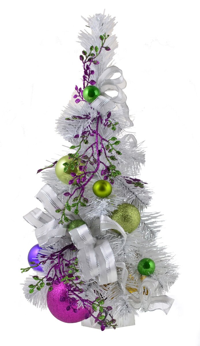 Нежнейшая ель белого цвета, украшенная с одной стороны салатовыми и фиолетовыми елочными шарами и утонченной веткой, выполненной в аналогичных шарам цветах с глиттерной присыпкой. Низ ели украшает объемный бант, выполненный из текстильной ленты с проволочными краями с обеих сторон по длине.