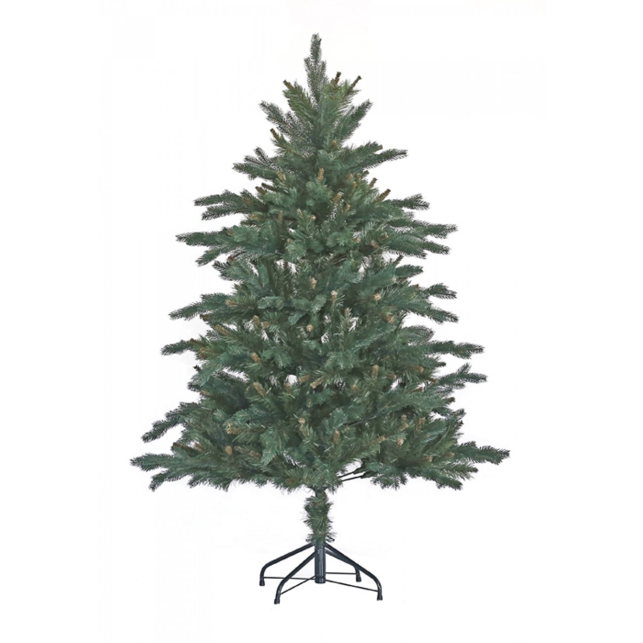 Материал: ПВХ пленка шириной 8,5 см; литые ветки; металл; проволока. Высота: 120 см. Диаметр нижнего ряда: 90 см. Ствол ели состоит из двух частей. Подставка ели — это металлическая крестовина с болтами, закрепляющими ствол.