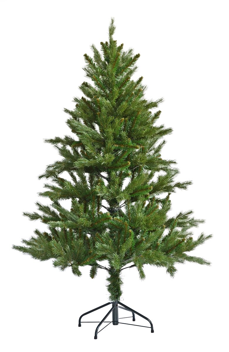 Материал: ПВХ пленка шириной 6 см; литые ветки; металл; проволока. Высота: 150 см. Диаметр нижнего ряда: 100 см. Ствол ели состоит из двух частей. Подставка ели — это металлическая крестовина с болтами, закрепляющими ствол.