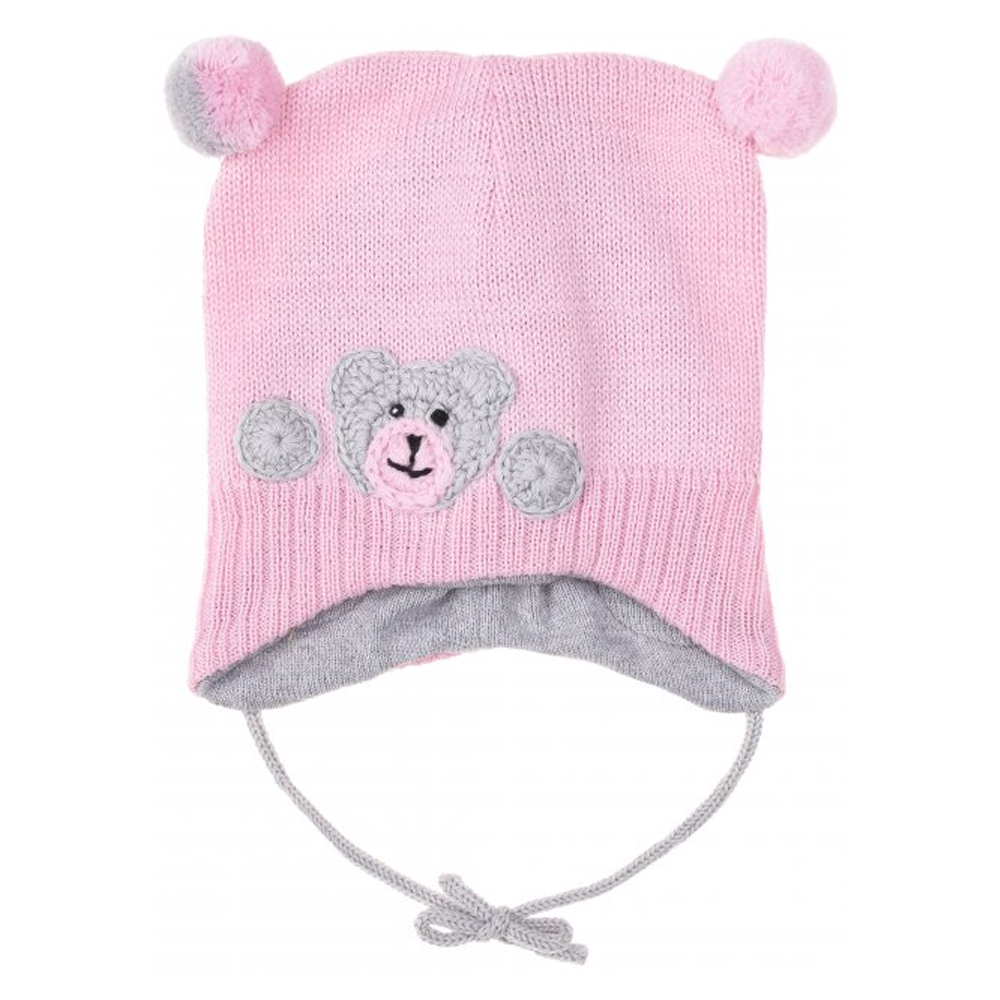 Теплая вязаная шапка для детей 3-4 лет. Состав: 50% шерсть, 50% акрил. Есть подкладка из 100% хлопка. Украшена вышивкой в виде мордочки медвежонка. Имеет завязки для фиксации на голове, ветрозащитные вкладыши-мембраны, помпоны "ушки". Размер - 50.