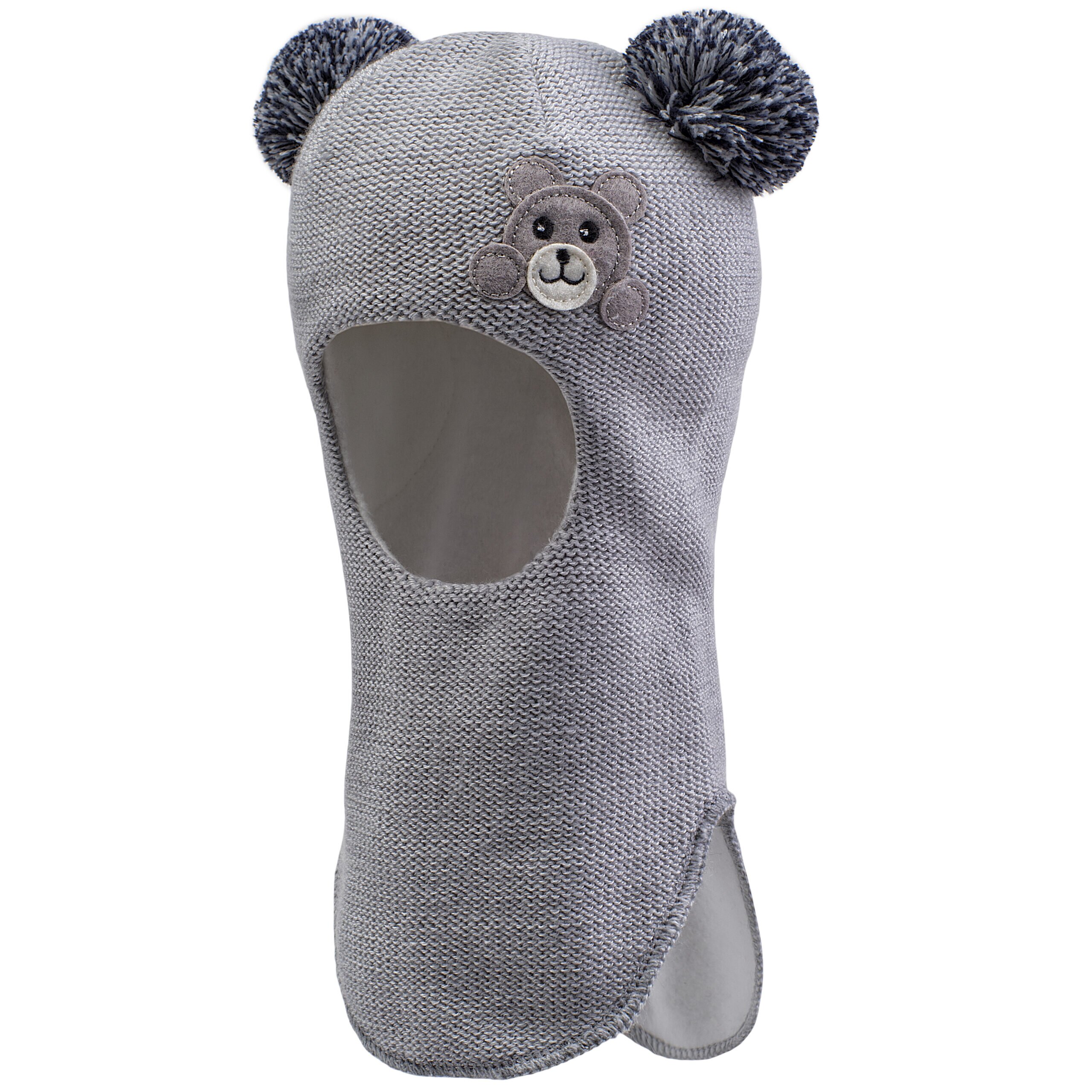 Теплая вязаная шапка "шлем" для малыша 1-2 лет. Хорошо защищает от ветра ушки и шею ребенка. Состав: 50% шерсть, 50% акрил. Есть подкладка из 100% хлопка. Украшена помпонами и вышивкой. Размер – 48.