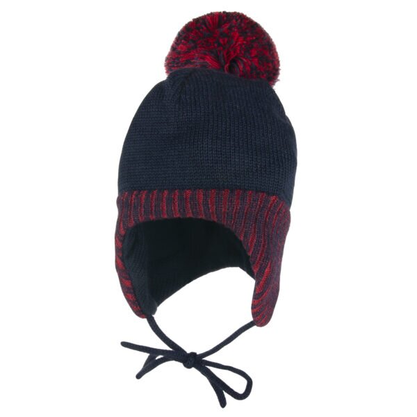 Теплая вязаная шапка для мальчика от рождения. Состав: 50% шерсть, 50% акрил. Есть подкладка из 100% хлопка. Украшена помпоном. Имеет завязки для фиксации на голове, ветрозащитные вкладыши-мембраны. Размер - 46.