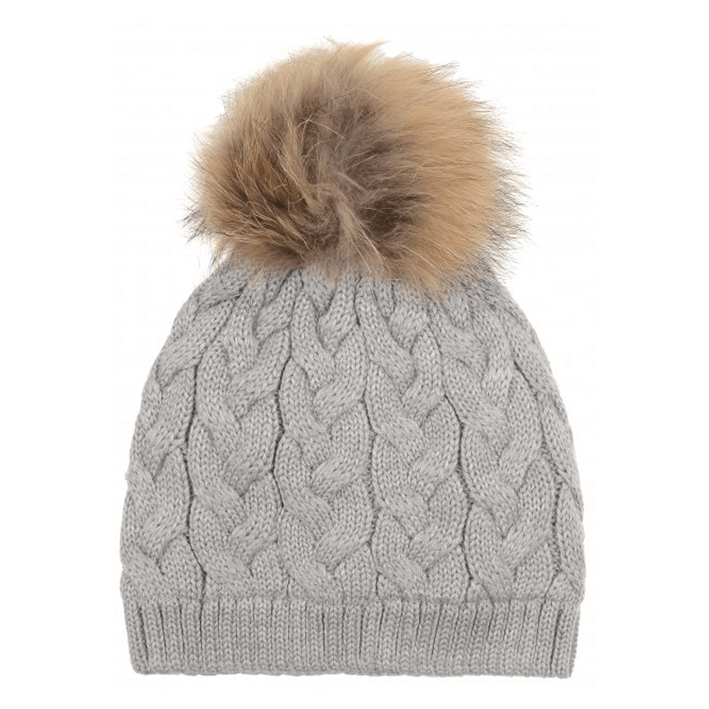 Плотное прилегание шапки к голове обеспечивает двойная вязаная резинка. Головной убор украшает узор "жгут", помпон из искусственного меха.